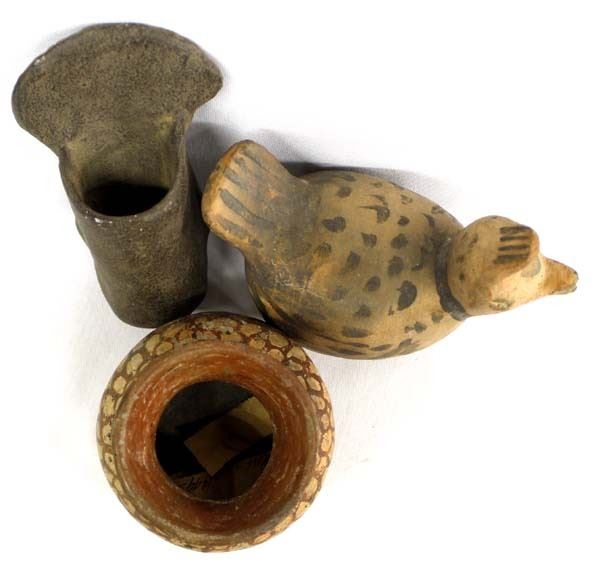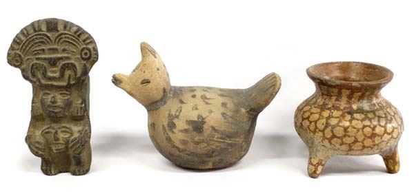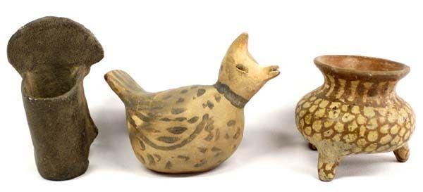 3 Pieces of PreColumbian Pottery Replicas, largest measures 5'' x 3.5'' x 2.75'', includes a 3-legged pot, a chicken, and a human effigy, the 3-legged pot has an old handwritten note inside which reads ''Western Nayarit 3-Leg-Bowl-Mexico-Red-w/Cream Colored Slip-Oxide-Stain-Pre-Columbian'' and on the back of this note is also written ''Arkiss-1949''