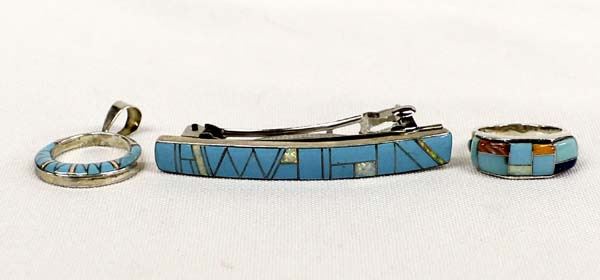 3 Pieces of Sterling Silver and Turquoise Jewelry, includes 1. Sterling Silver Turquoise and Opal Barrette, measures 2 3/8''L x .25''W 2. Sterling Silver Turquoise and Opal Pendant, measures 1 3/8'' x 7/8'', stamped sterling 3. Sterling Silver Turquoise, Orange Shell, Lapis, Opal, and Red Shell Ring, size 7 x .25''W, nice lot with lots of beautiful colors, 15.83g in total wt.