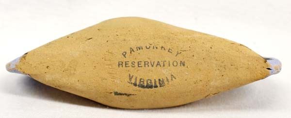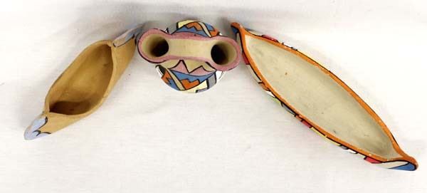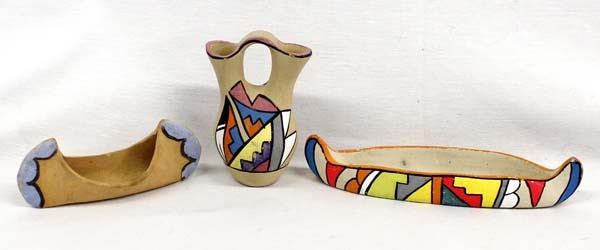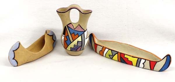 3 Pieces of Vintage Native American Pottery, includes: 1. Pamunkey Reservation Pottery Canoe (Virginia), measures 5.75''L x 2''H x 1.75''W 2. Jemez Poster Paint Pottery Canoe, measures 8''L x 1''H x 2''W 3. Tesuque Pottery Wedding Vase, measures 4''H x 3''W x 2 3/8''Deep