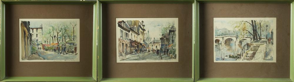 Pierre Cambier, 1865-1942, Belgium. Includes painting titled "Paris Le Port Marie," depicting bridge with boats and figures walking nearby. A painting titled "Montmartre-Place du Tertre," depicting a street scene with figures about. And a painting titled "Montmartre-Place du Tertre," depicting a variation of a street scene from the latter. All measure 9" H x 12.25" W (sight), matted in brown and in three identical green frames behind glass, all are signed.