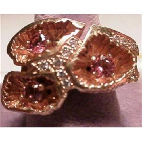 This is an odd ring and is perfect for the lady who wants something different. It is actually a designer ring made by Leiberman. The mounting is in heavy 14kt yellow gold and has 3 flower like oval designs where there is a pink tourmaline in center of each flower.There are also some diamonds sprinkled around the center and one side to give it sparkle. A very feminine looking ring. Size 6 1/2 to 7.