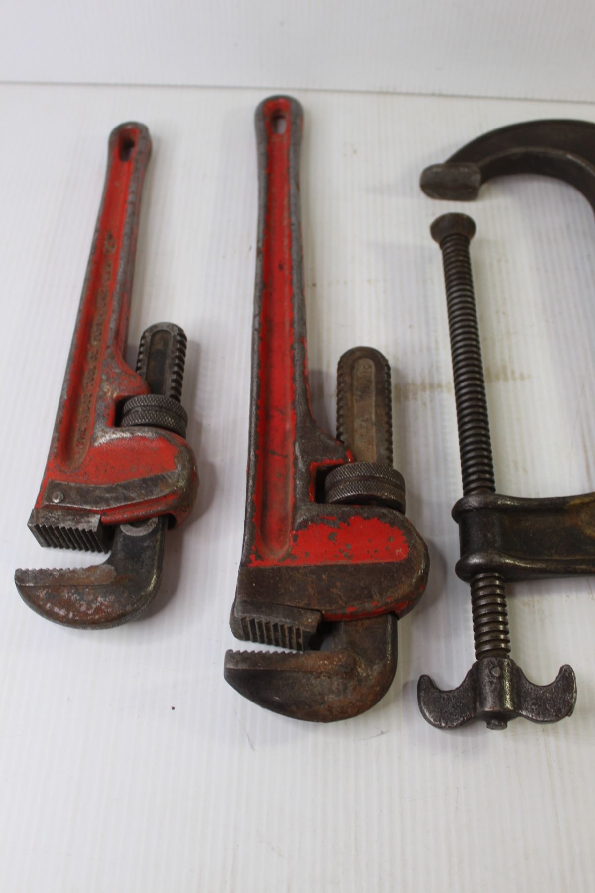 (3) Pipe Wrenches, Mallet, Clamp, Steel Bar