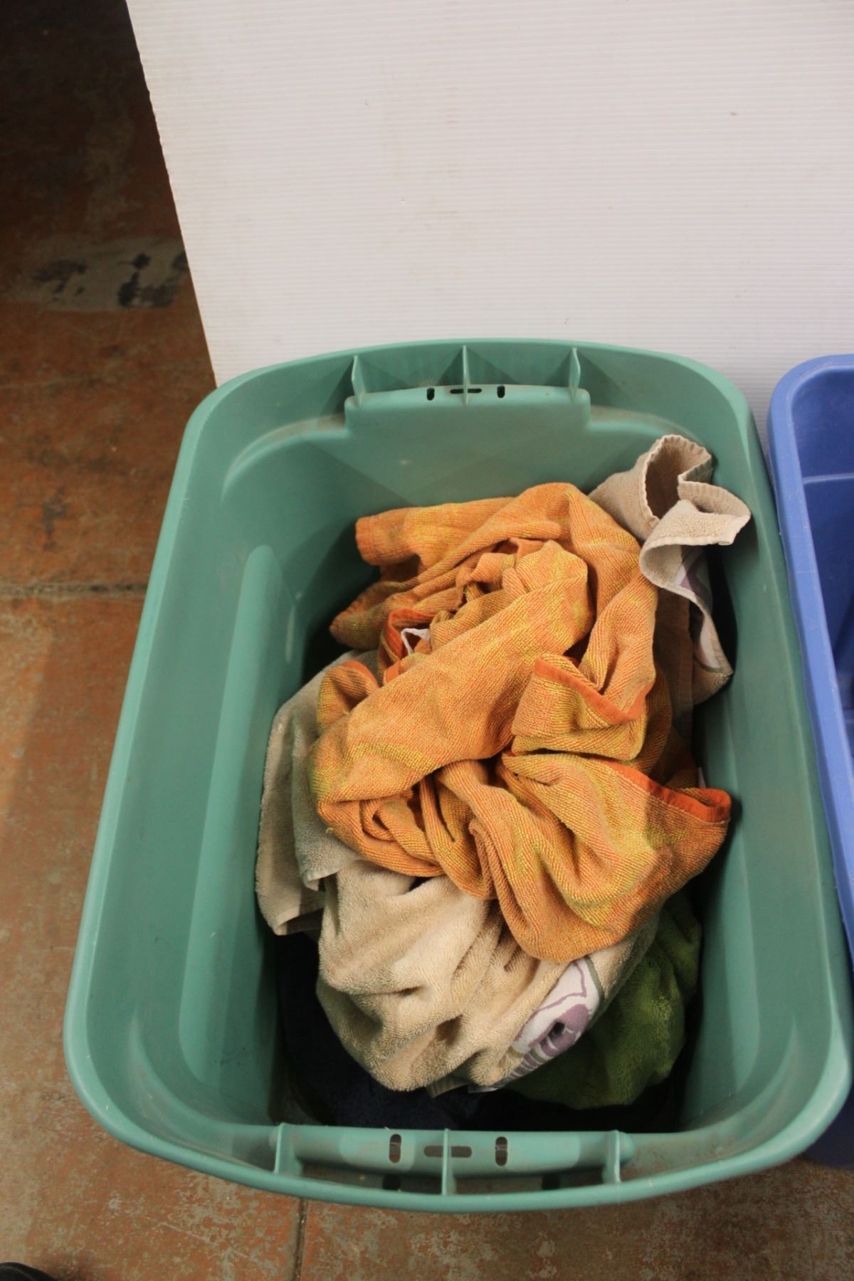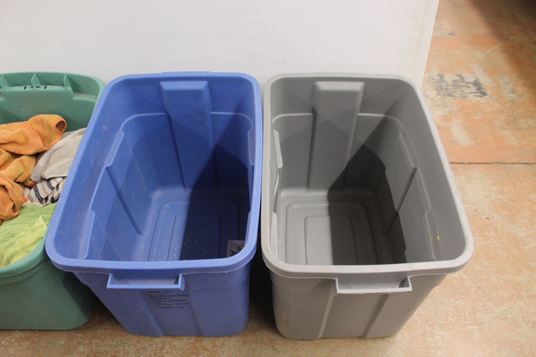 * (3) Plastic Totes 21'' x 16'' and Assorted Towels