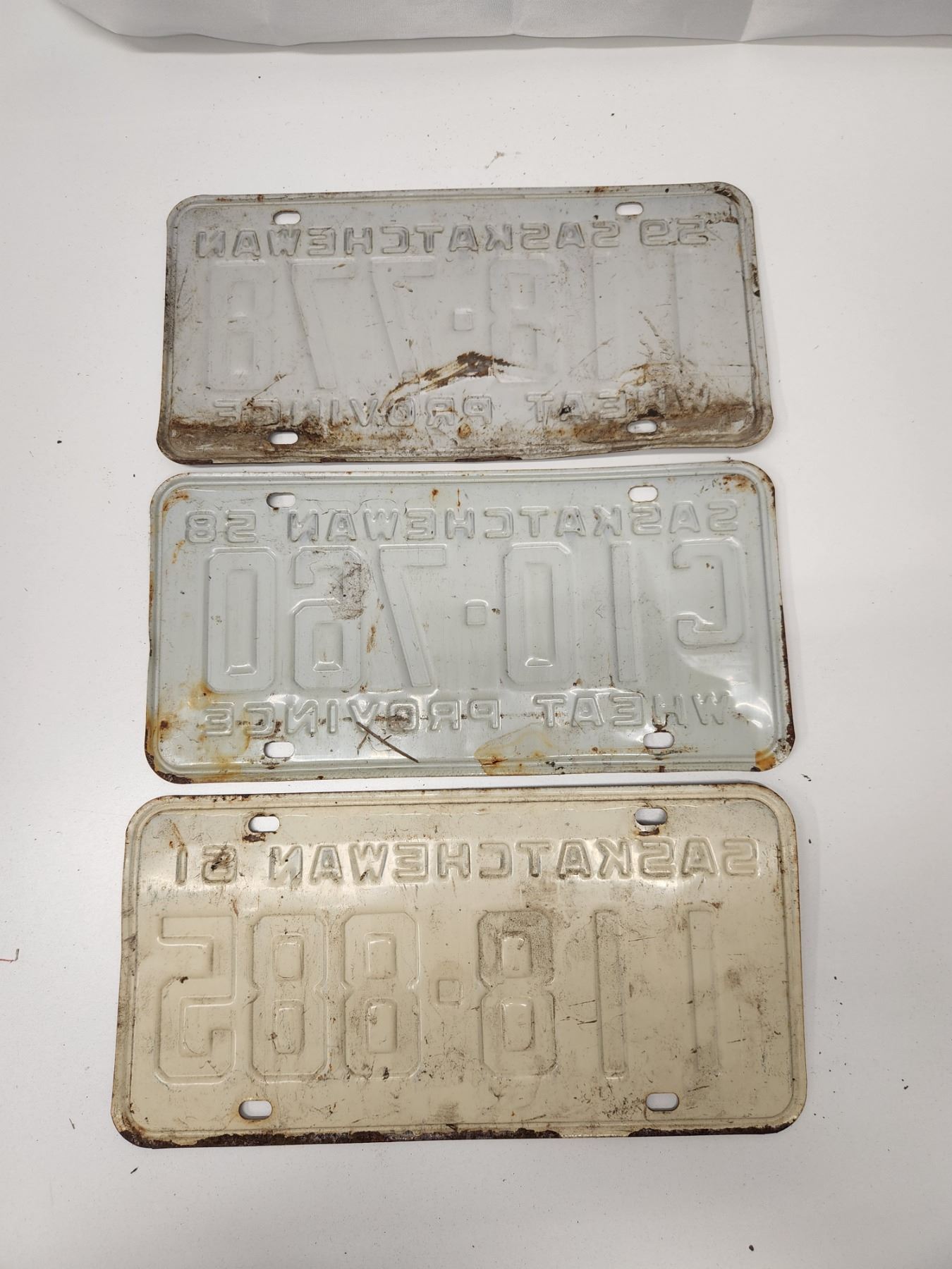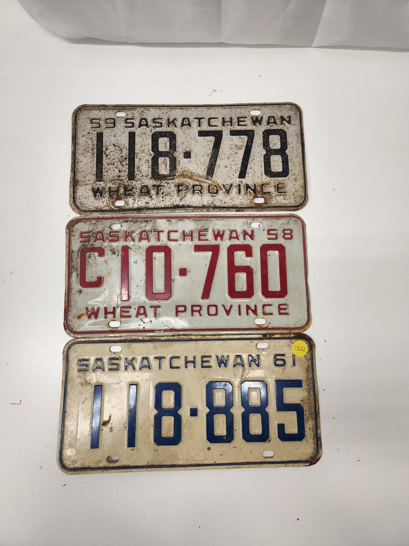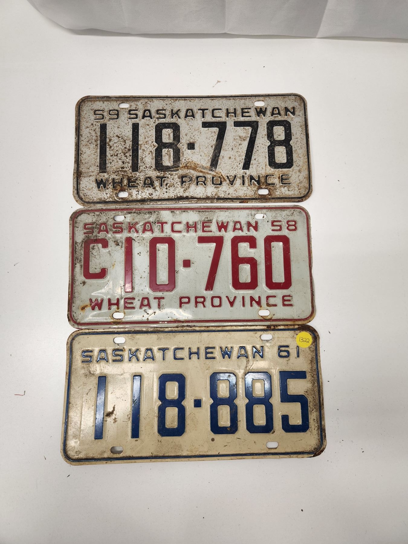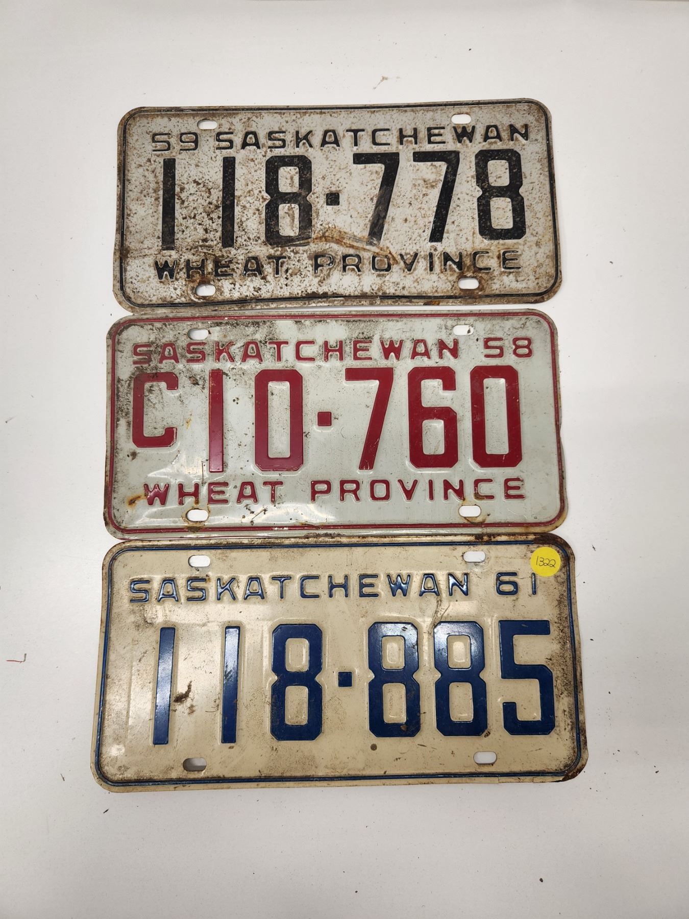 (3)Plates: 118-778 Wheat Province 59-Sask, C10-760 Wheat Province 58-Sask, 118-885 61-Sask