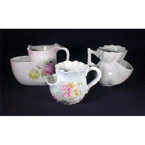 This is a fine lot of 3 scuttle mugs. The first one is in light blue with flowers. It is delicate and petite measuring 5? at widest x 3 3/8?h x 3? deep. It has four hair line cracks along the body. It has a few flea bits to the rim and it is rough along the rim to the touch. There is also quite a bit of wear to the gold enameling along the rim. With all of these little problems it is still quite beautiful and elegant. The second scuttle mug it all over white with gold enameling along the rims ? though the enameling is quite worn. This little beauty is in an allover shell design and it measures 5 3/8? at widest x 4?h x 3 3/8? deep. I?m not 100% sure but I suspect that this mug had an all over decoration that has now fully worn off. The third scuttle mug is quite large measuring 6 ½? at widest x 4 ¼?h x 3 1/8? deep. It has a very elegant pink and teal green color around the edges with pink and yellow flowers on each side. It has a fairly large chip to one of the edges measuring 3/8? long. But other then that it is in very good condition. This scuttle mug has an impressed mark on the bottom of ? GY 148Y. These three pieces would be quite the addition to any collector of barber shop or shaving item pieces!