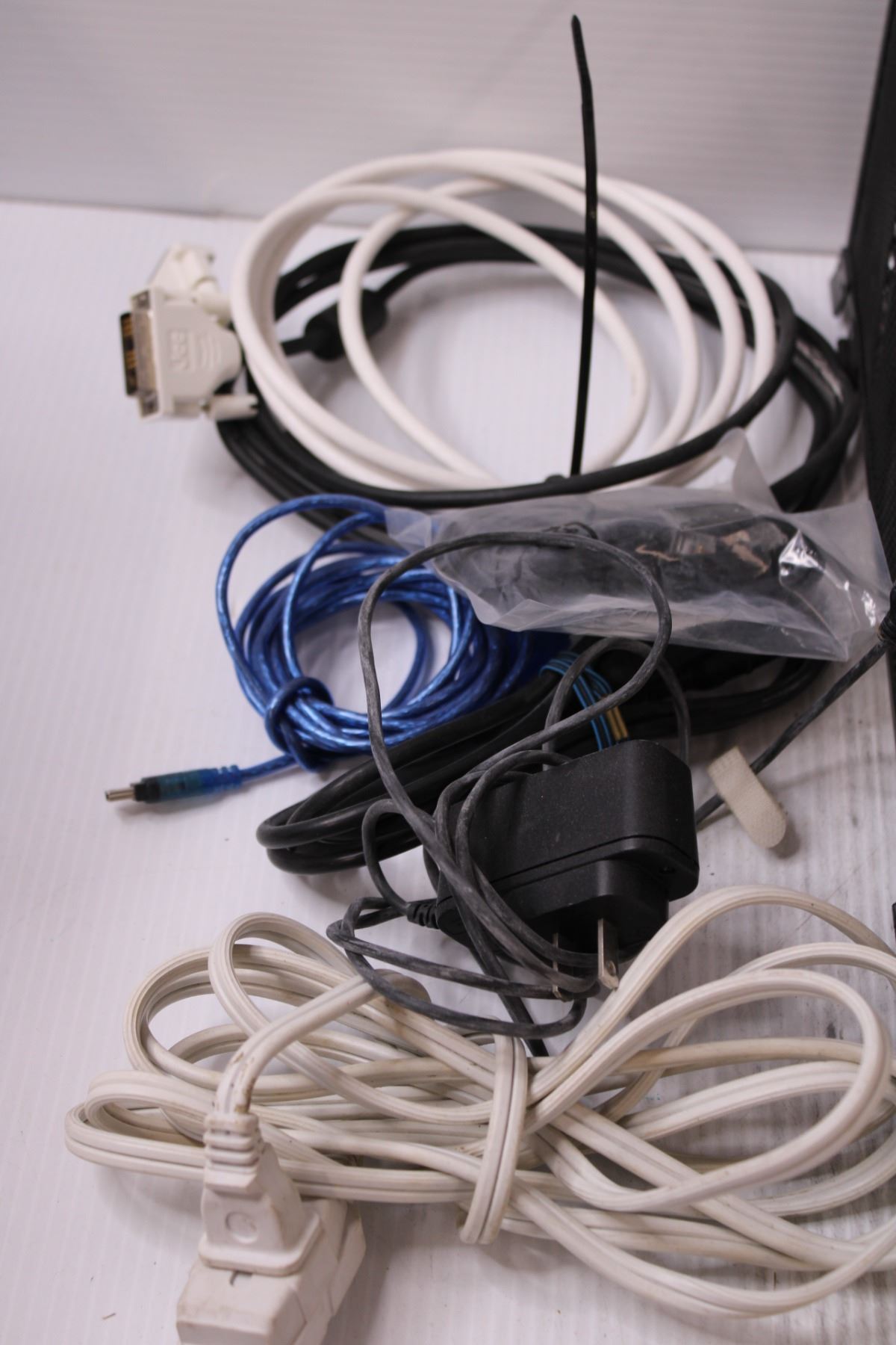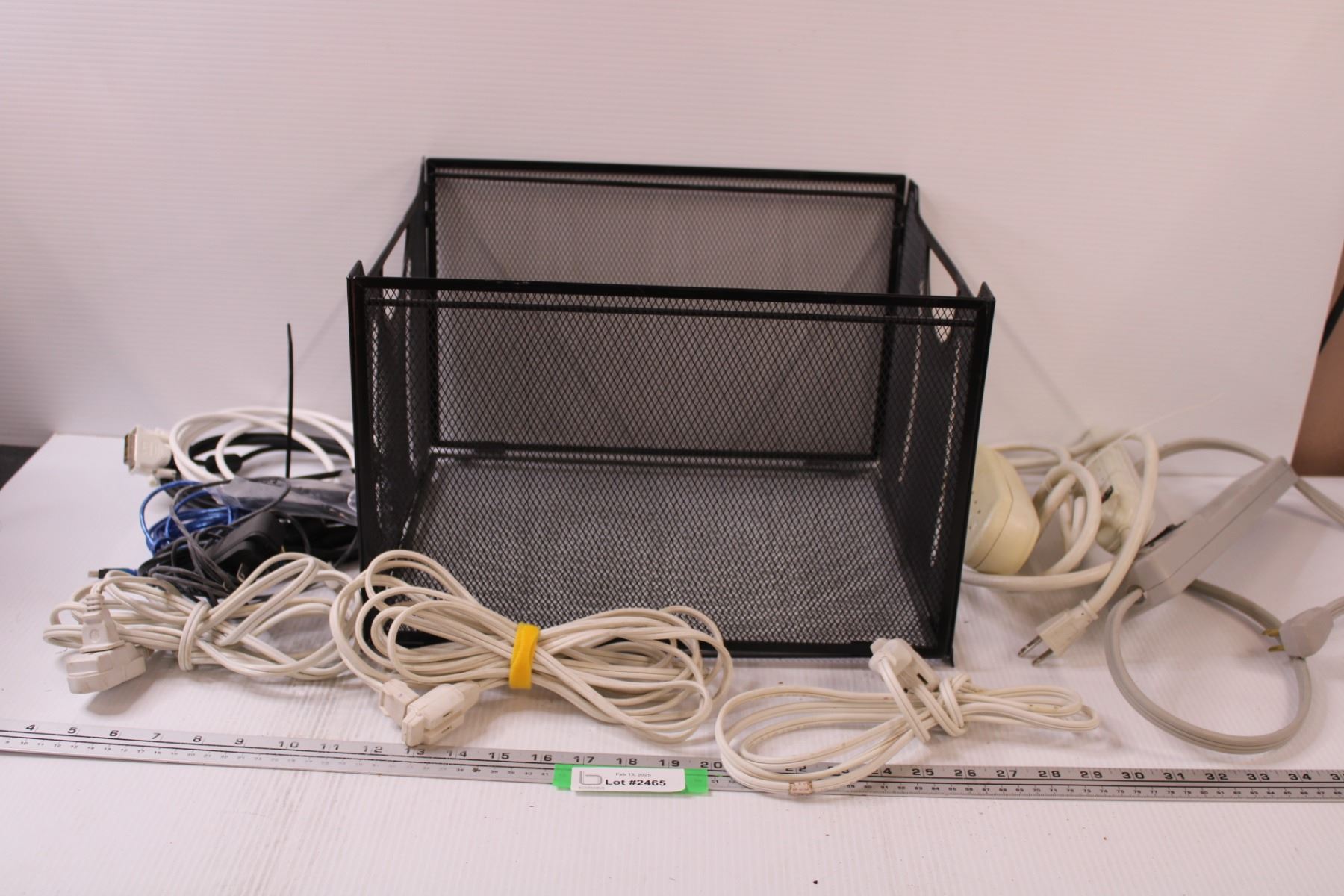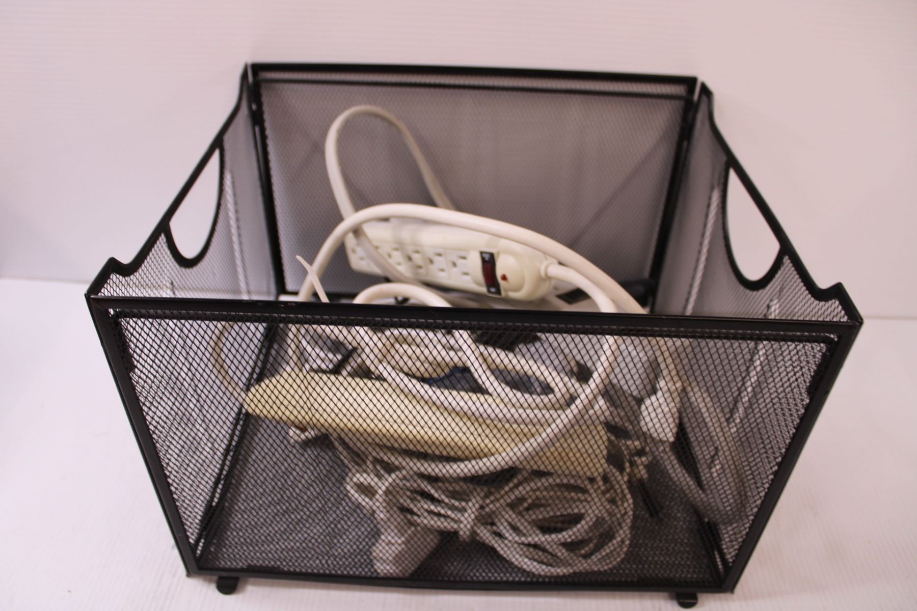(3) Power Bars, (3) Extension Cords, Various Cords in Metal Crate Box - 15" x 13" x 10"
