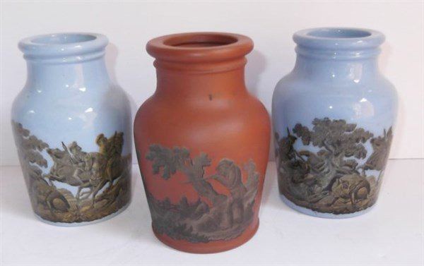 3 1800's Prattware transfer ware mustard pots with Boar Hunt Scene. Chip on bottom of 1; scratches. 4 1/2 inches high x 2 1/4 inches wide.