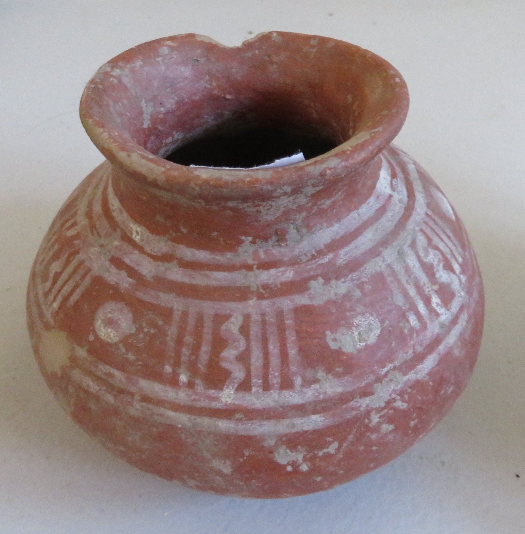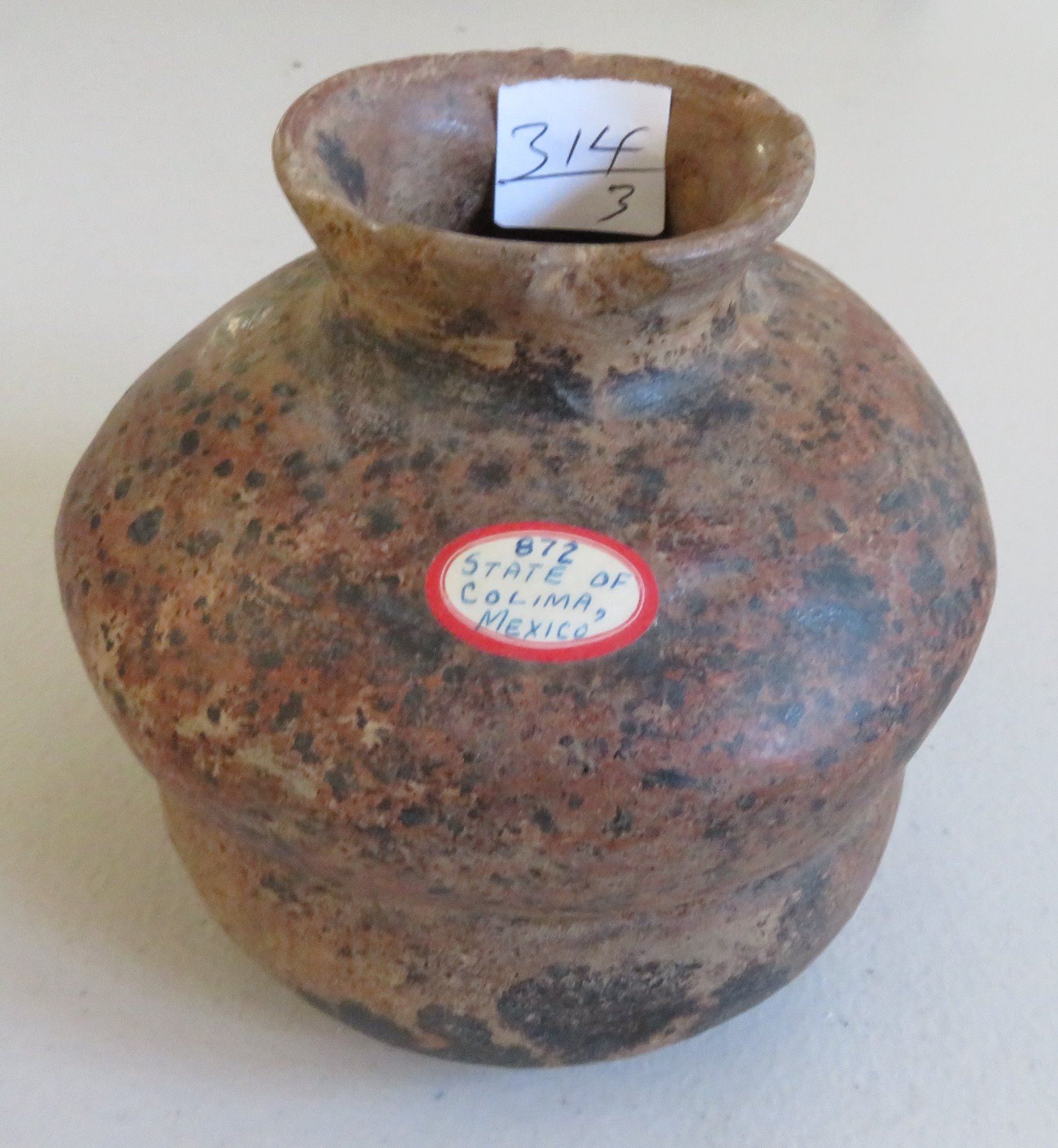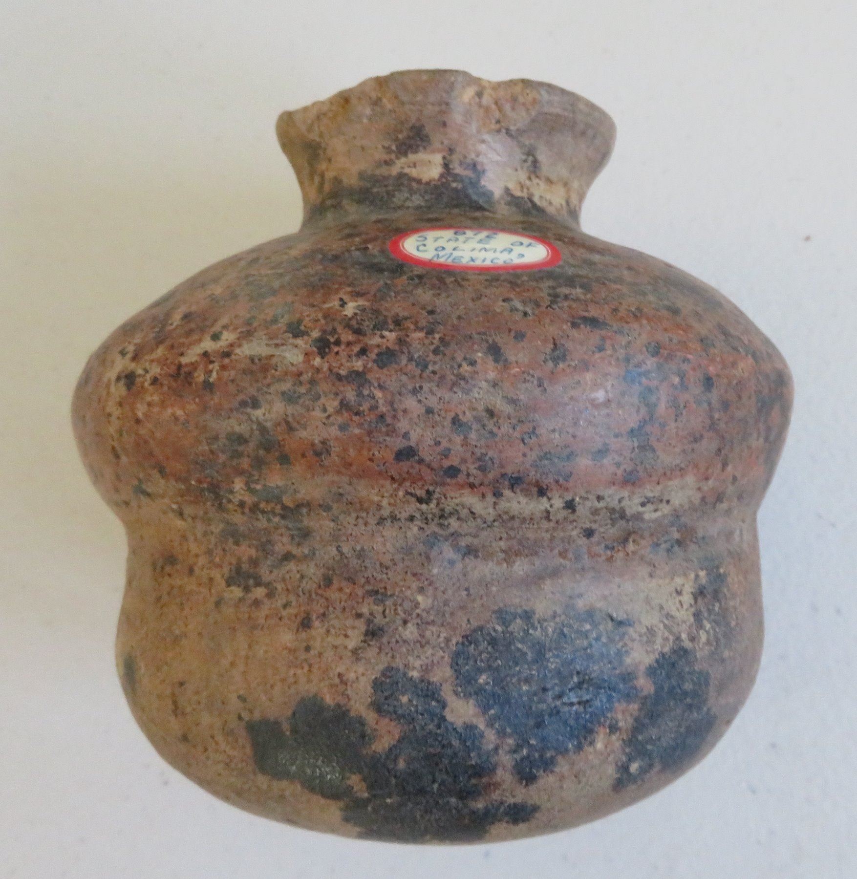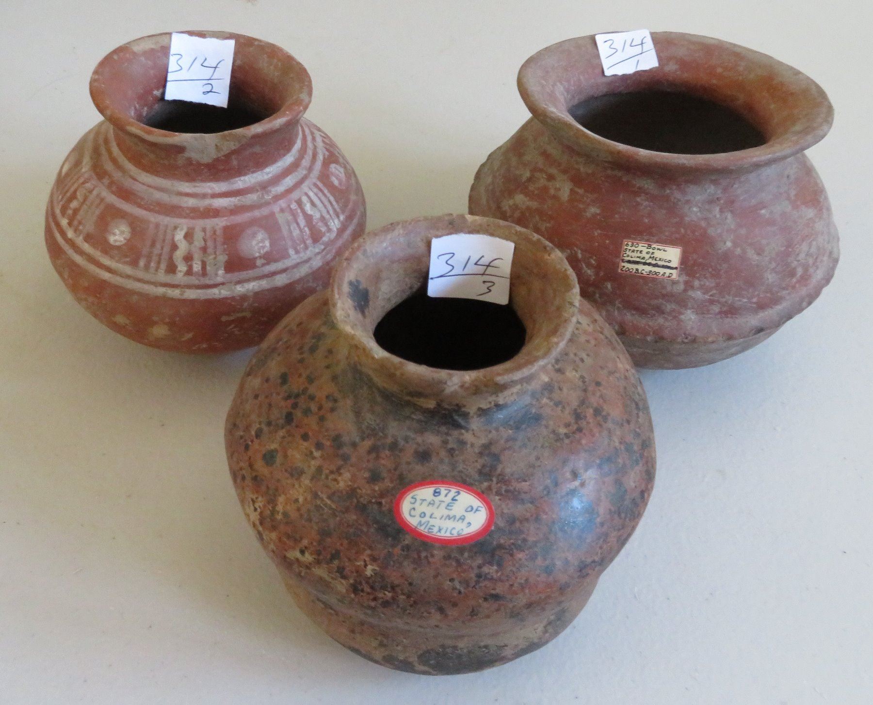 3 Pre-Columbian Ollas, pre-Columbian items. Made of clay and paint, the largest item measures 6" x 5". Colima, Mexico. Condition: Minor nicks and scratches, see images. Shipping: $45.00 w/insurance and signature, double-boxed, due to value and size.