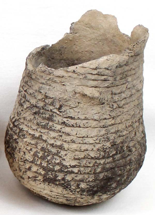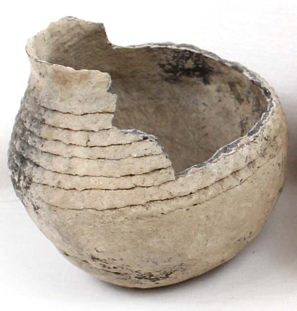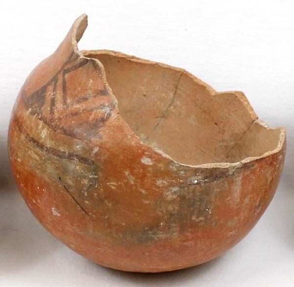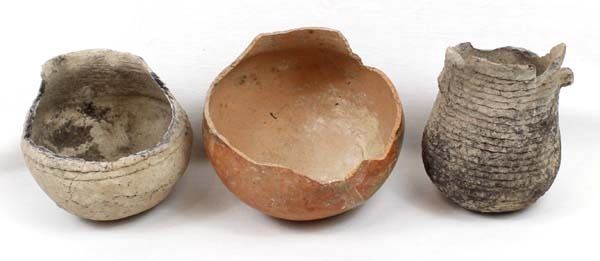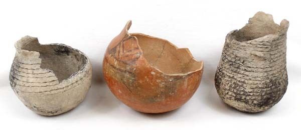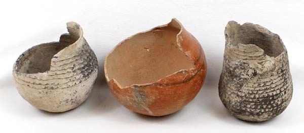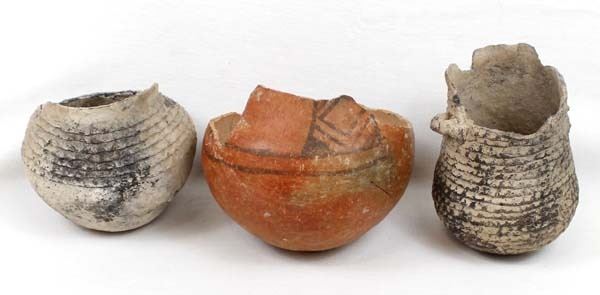 3 Prehistoric Native American Pottery Bowls, all are missing the top portions, largest measures 5 5/8'' x 4.75'', 2 are corrugated utilitarian jars while the other is a black on red geometric and has been glued, chipping all around the rim, Acquisition is in compliance with all state and federal regulations.