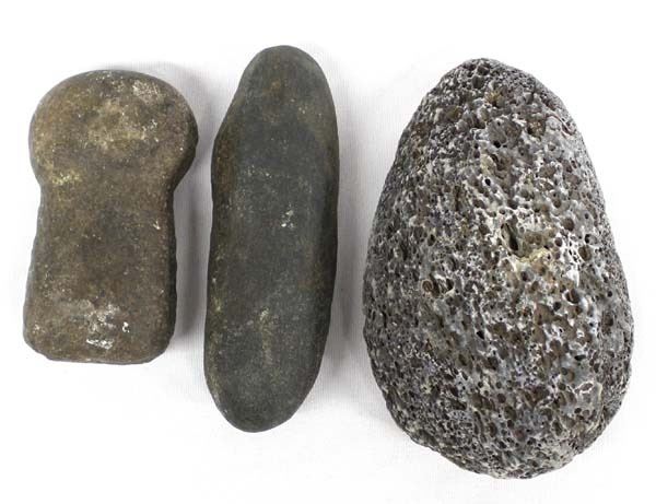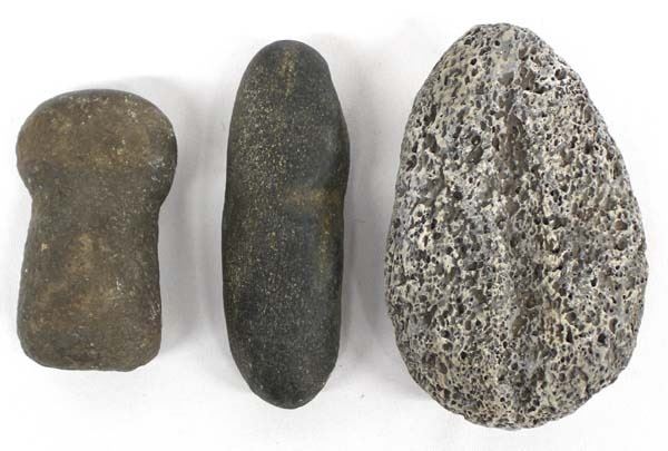3 Prehistoric Native American Stone Tools, largest measures 5.5'' x 3'', includes arrow shaft straightener, fully hafted and half hafted mauls, Acquisition is in compliance with all state and federal regulations.