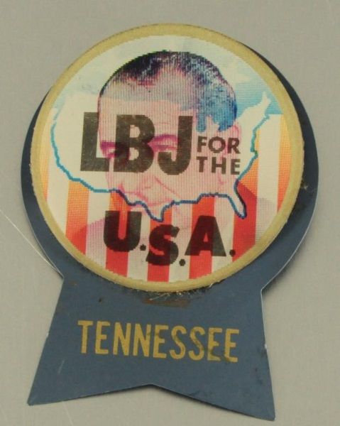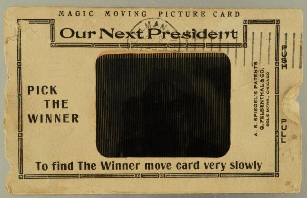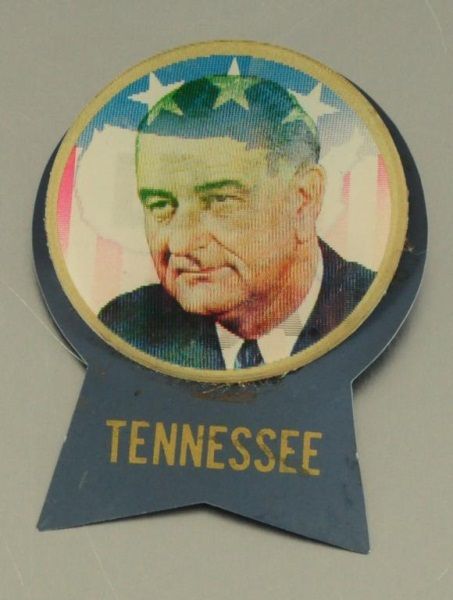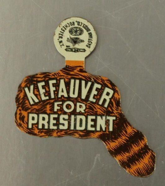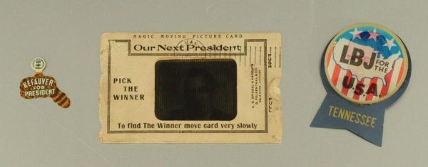 Pin "Kefauver For President", 1964 "LBJ For The USA" "Tennessee", 1912 Woodrow Wilson Vs Teddy Roosevelt "Magic Moving Picture Card Pick The Winner Our Next President" postcard.