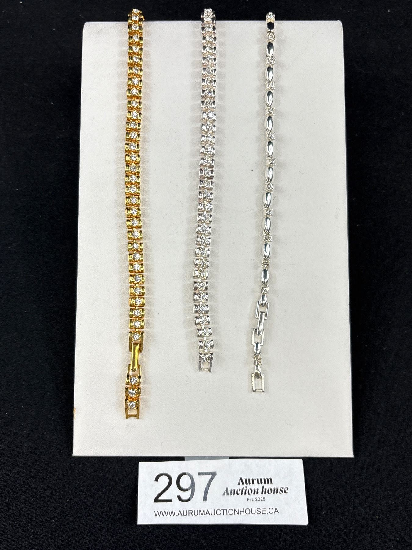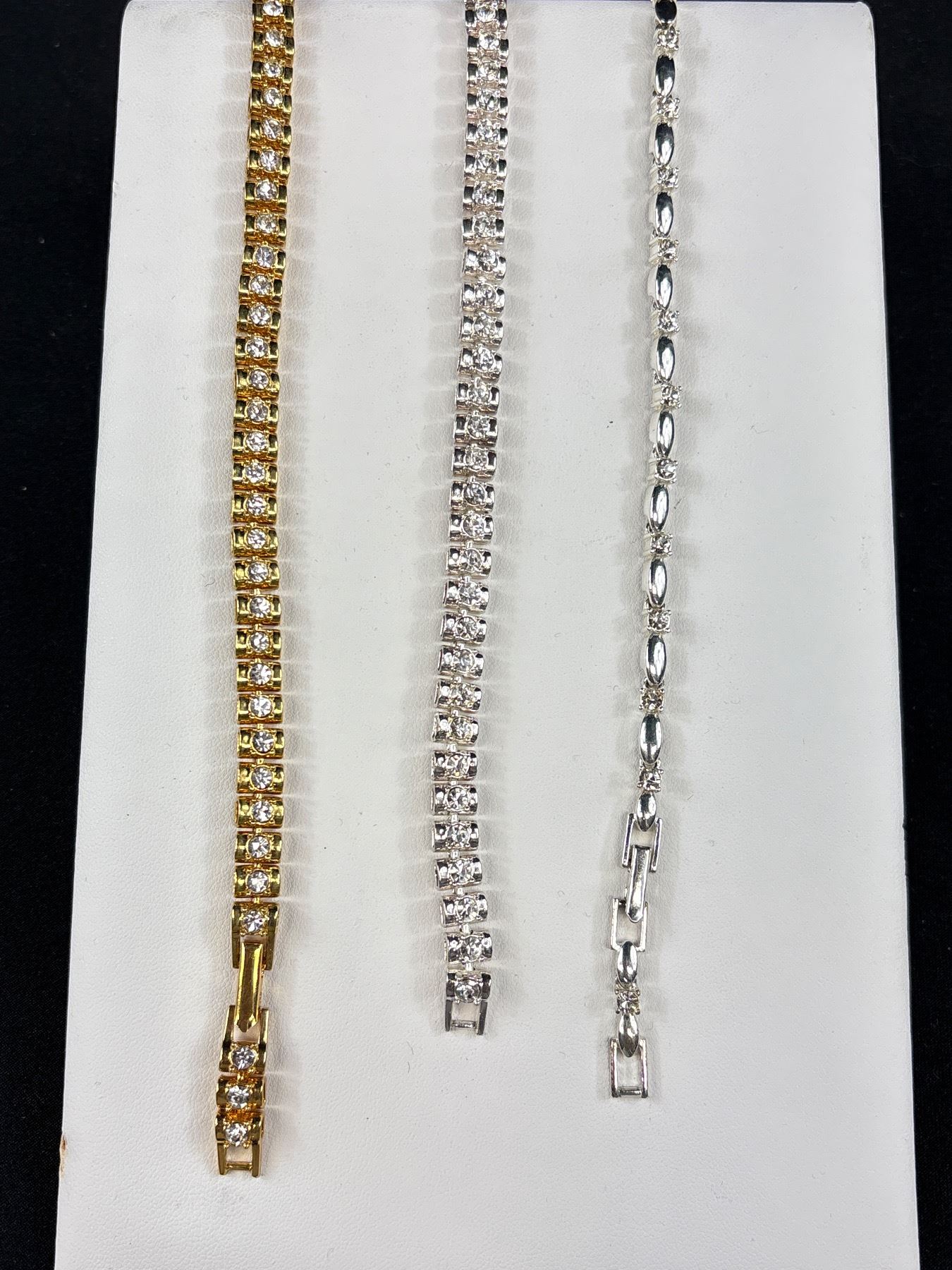 3 Pretty Silver and Gold Plated Tennis Bracelets with Stand