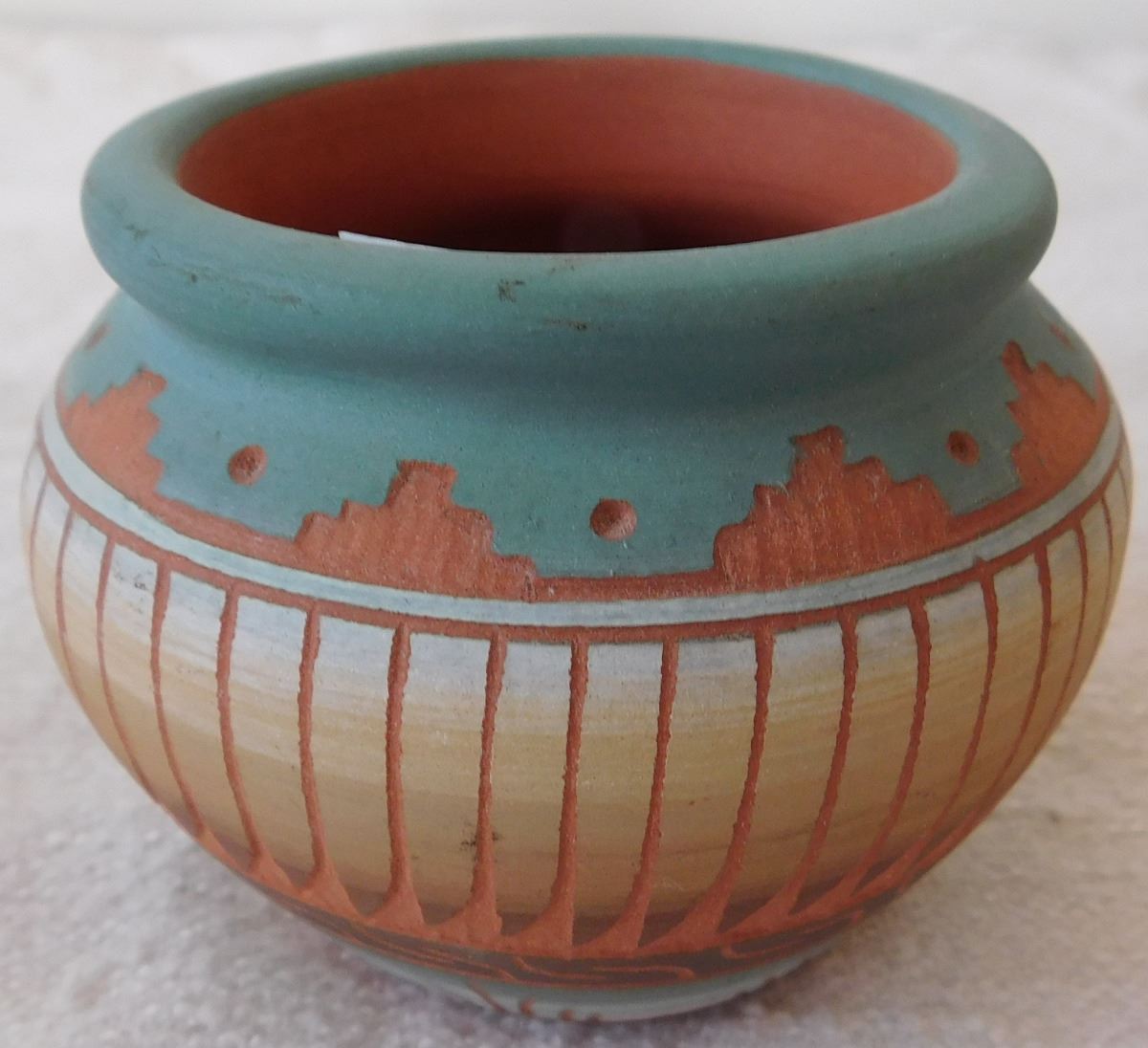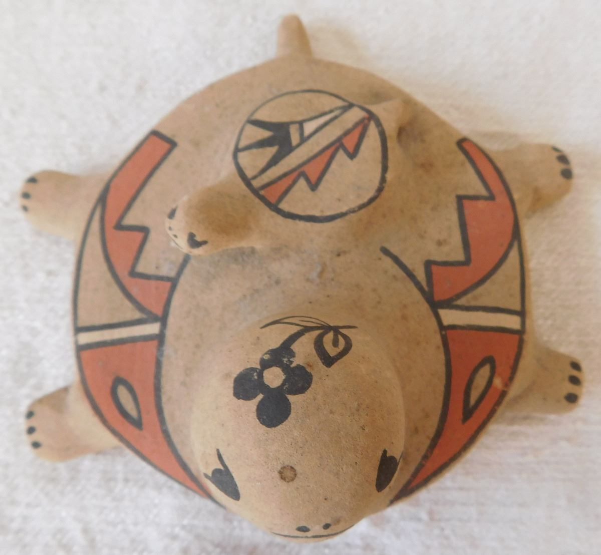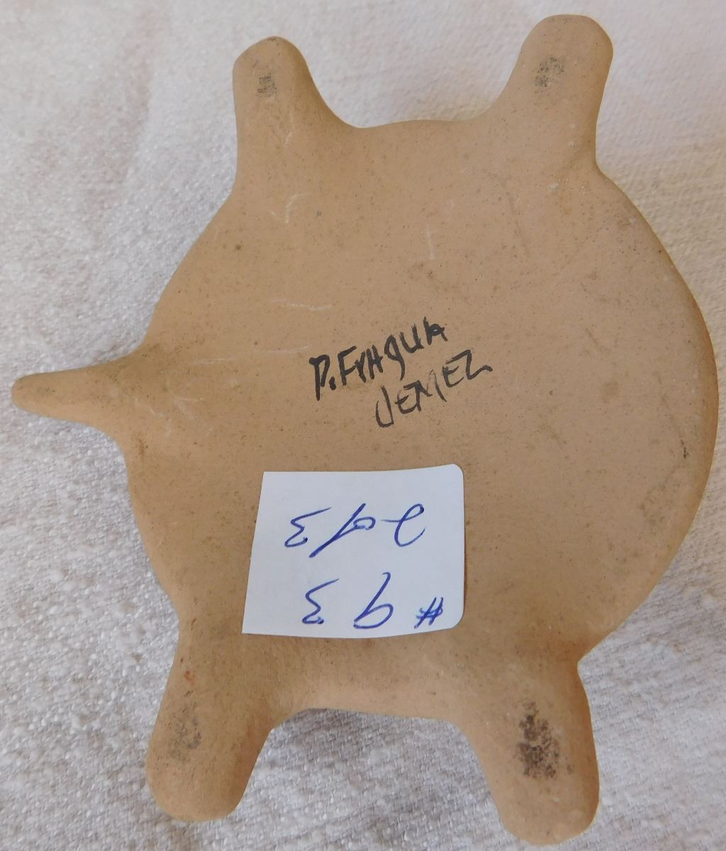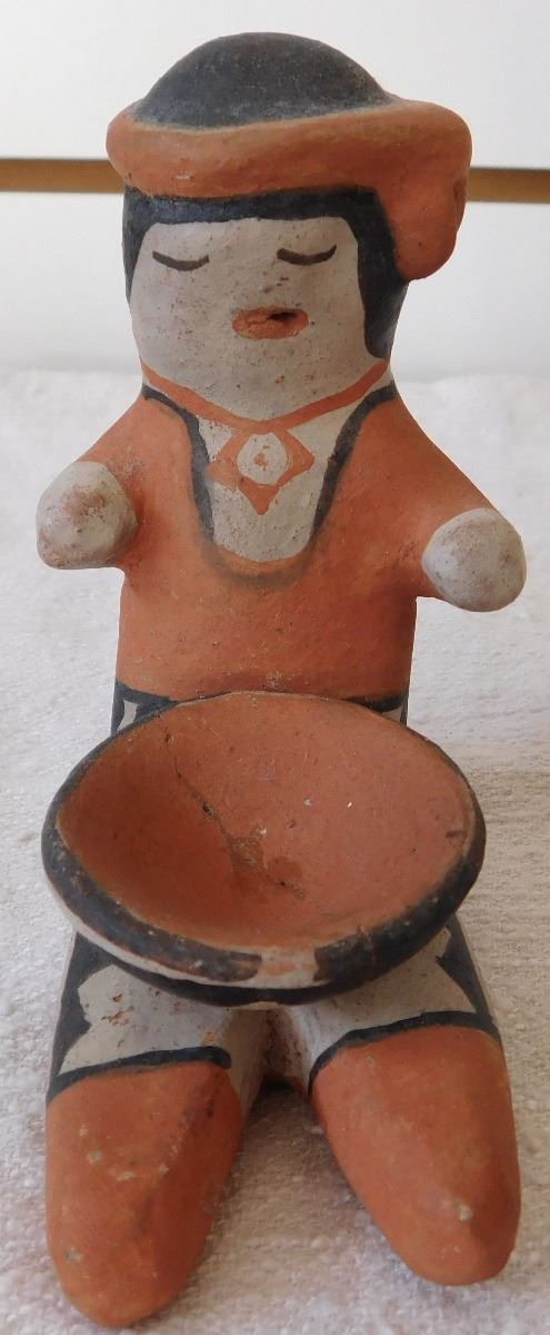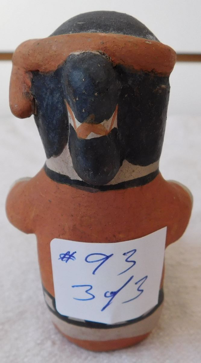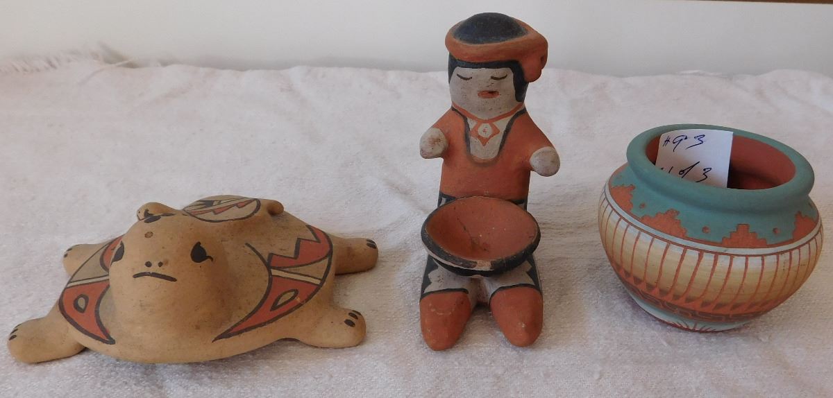 3 Pueblo Ceramic Items, modern 20th century pieces. Made of clay and paint, the smallest measures 2.5" and the largest is 5". From New Mexico. Condition: Good, small bowl on doll cracked and reglued, see images. Shipping: $30.00.