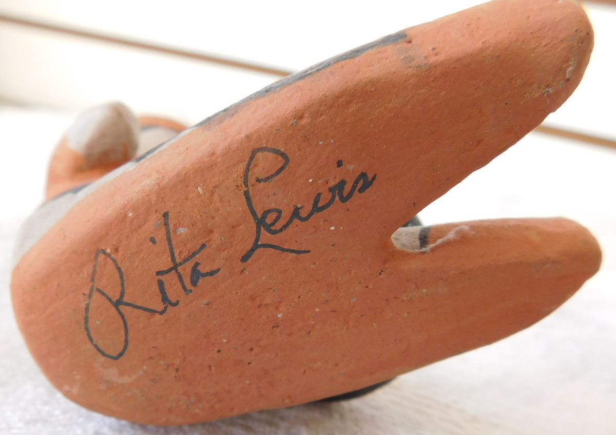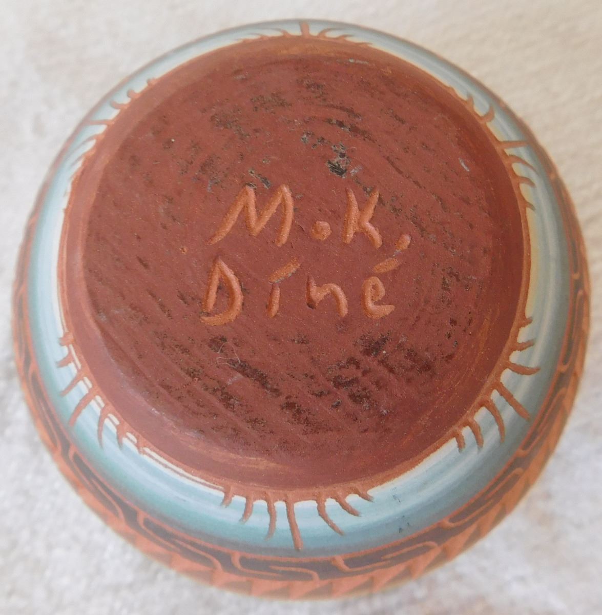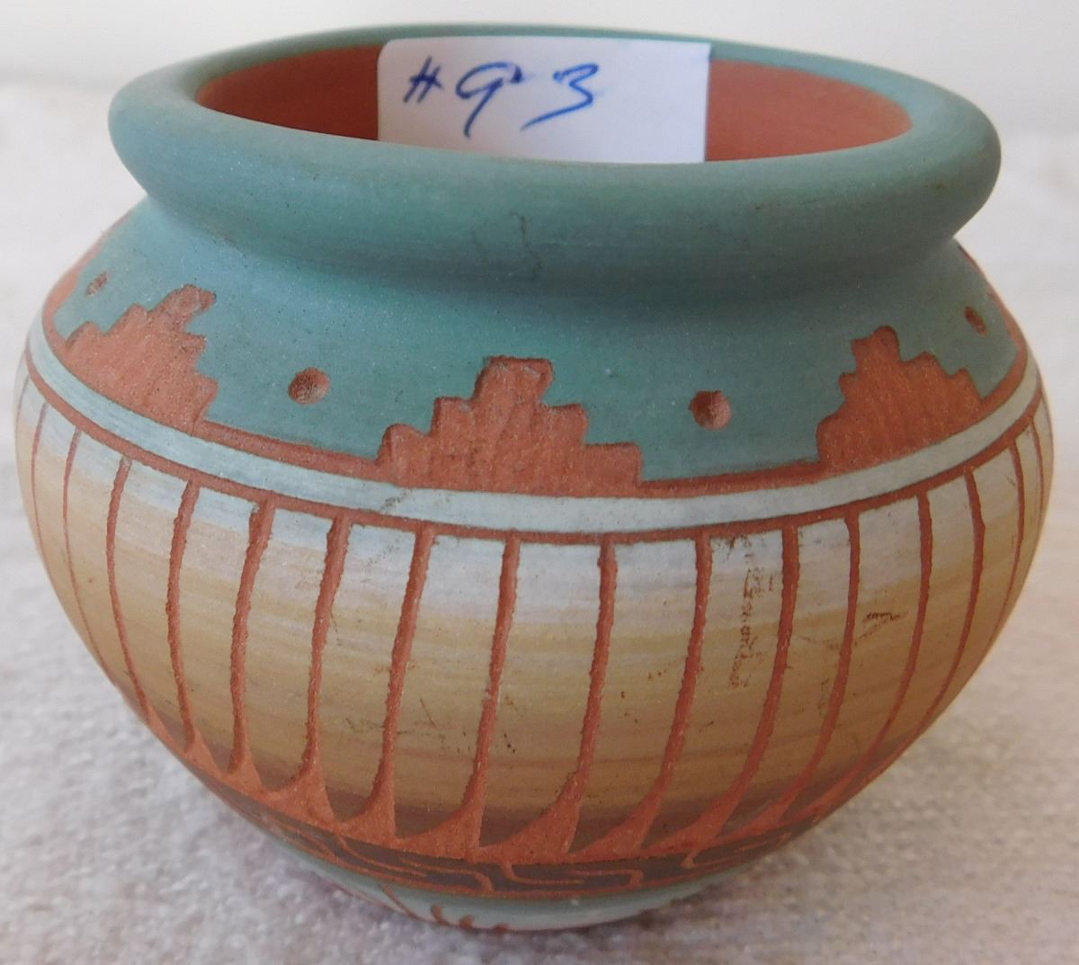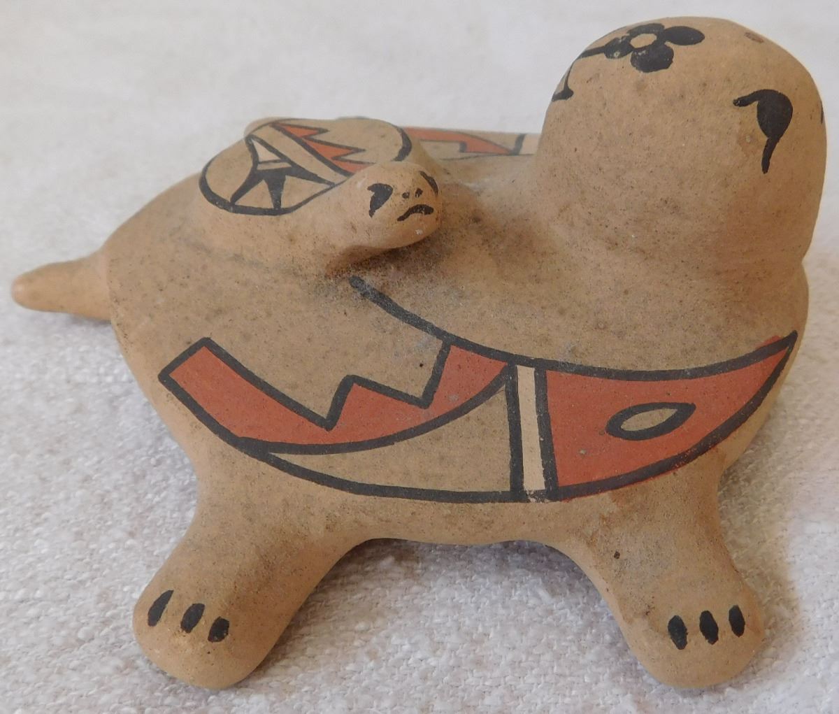3 Pueblo Ceramic Items, modern 20th century pieces. Made of clay and paint, the smallest measures 2.5" and the largest is 5". From New Mexico. Condition: Good, small bowl on doll cracked and reglued, see images. Shipping: $30.00.