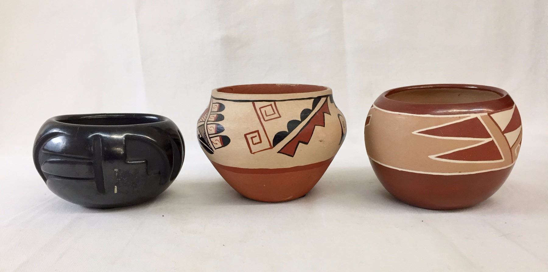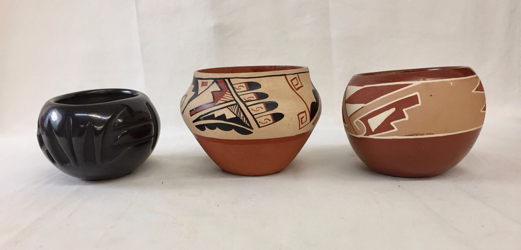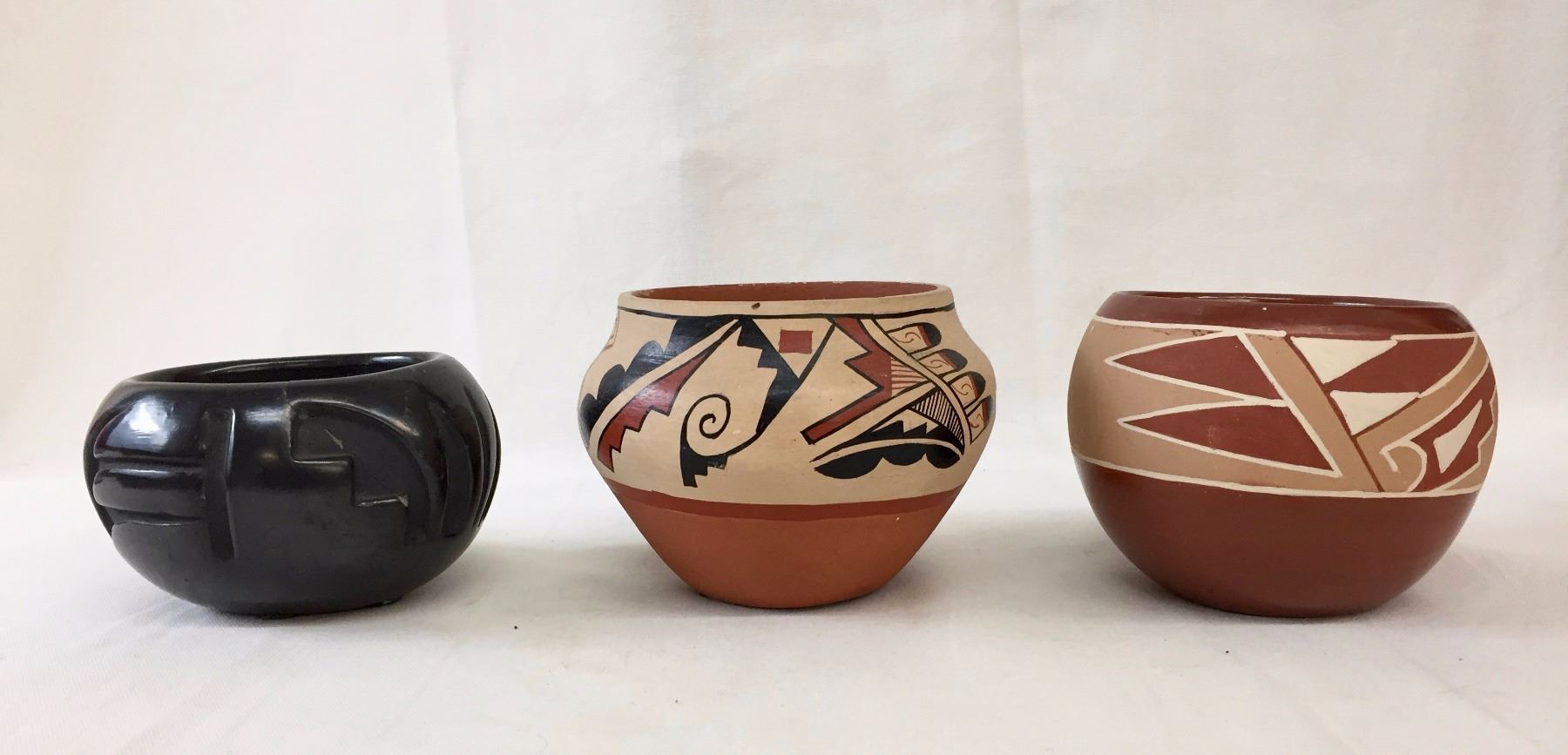 Description: 3 Pueblo pots. Maker: Various Pueblo makers. Approx. Age: Vintage. Size: Sizes range from 5 3/4” w x 4” deep to 4” w x 2 1/2” deep. Condition: Good for their age, normal wear expected. Please look closely at the pictures - they are an important part of our description. Shipping: There will be a $10 handling / packaging fee for shipping this lot. The actual cost of postage will be added on top of that.
