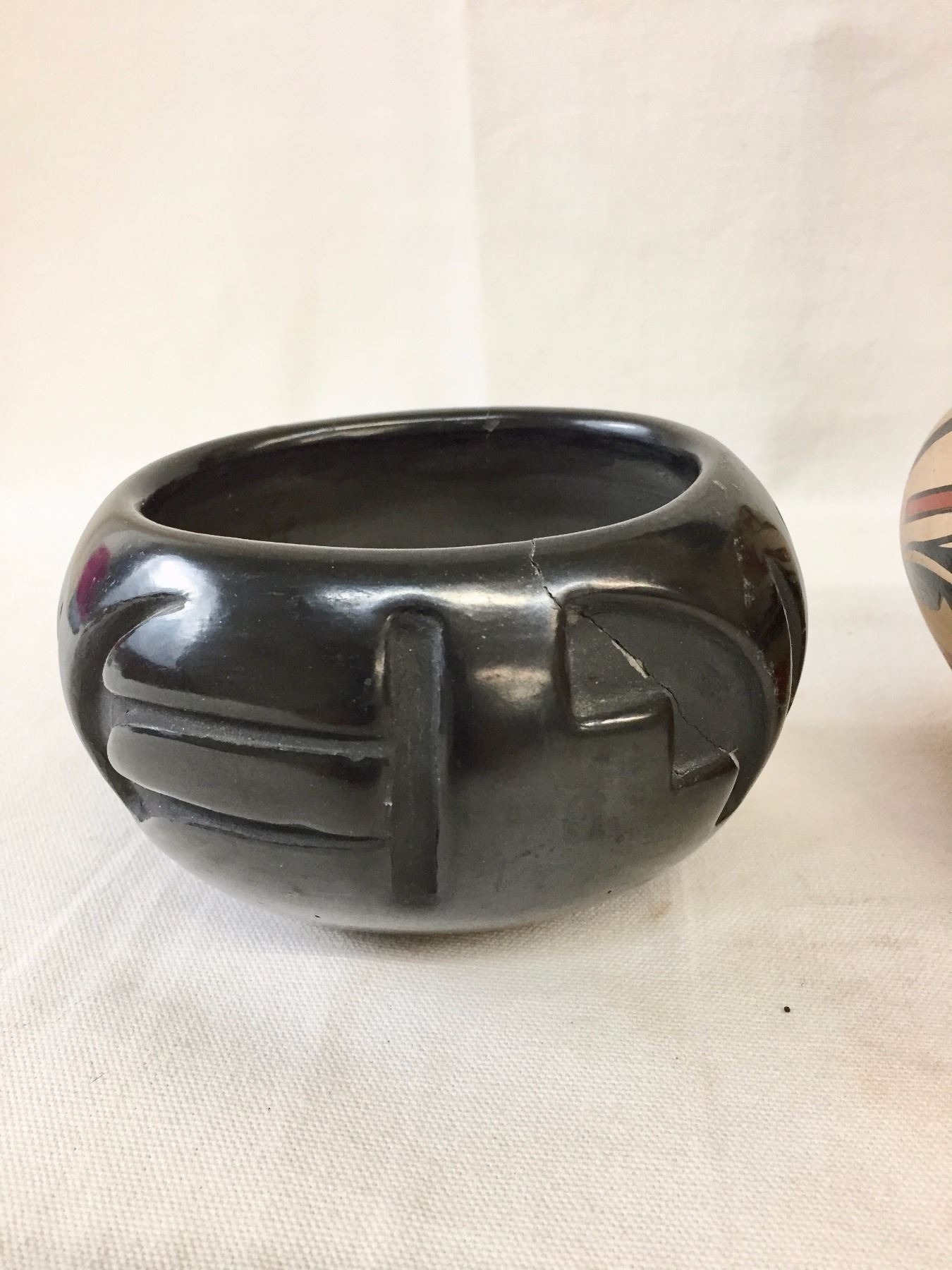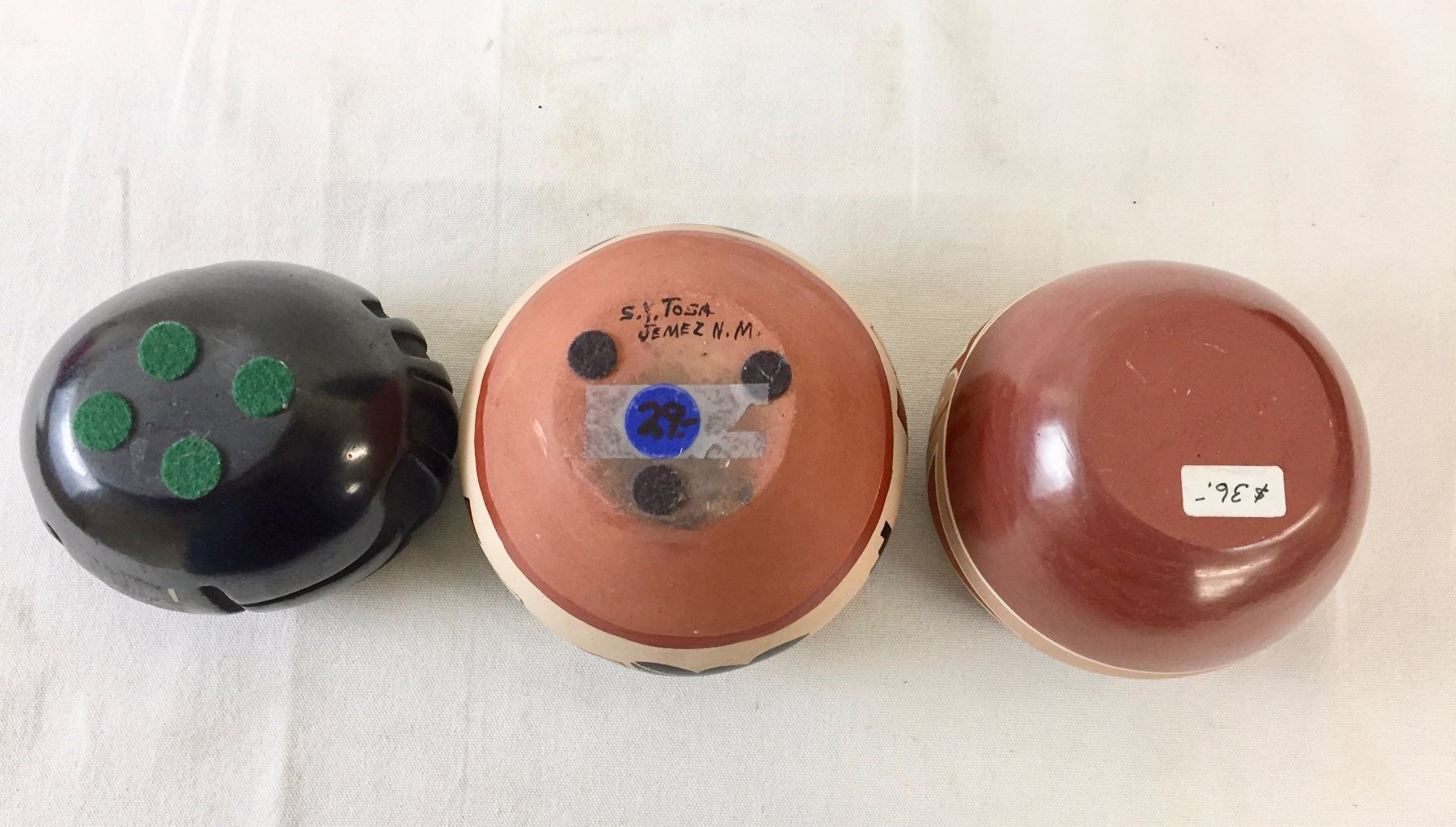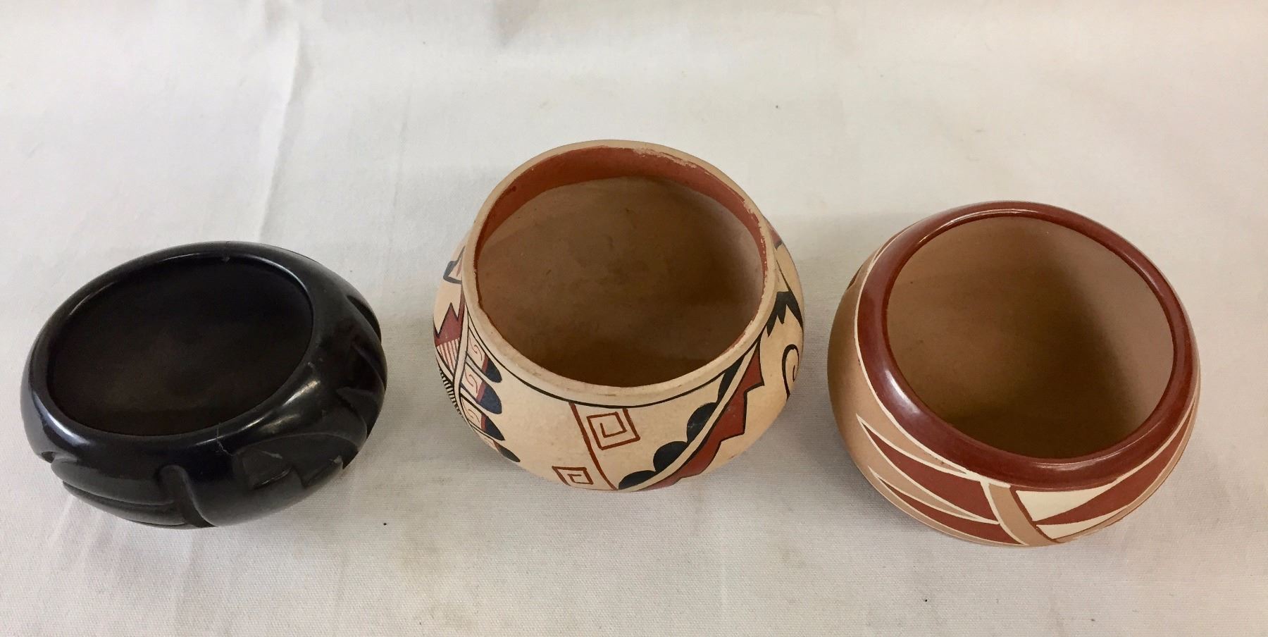 Description: 3 Pueblo pots. Maker: Various Pueblo makers. Approx. Age: Vintage. Size: Sizes range from 5 3/4” w x 4” deep to 4” w x 2 1/2” deep. Condition: Good for their age, normal wear expected. Please look closely at the pictures - they are an important part of our description. Shipping: There will be a $10 handling / packaging fee for shipping this lot. The actual cost of postage will be added on top of that.