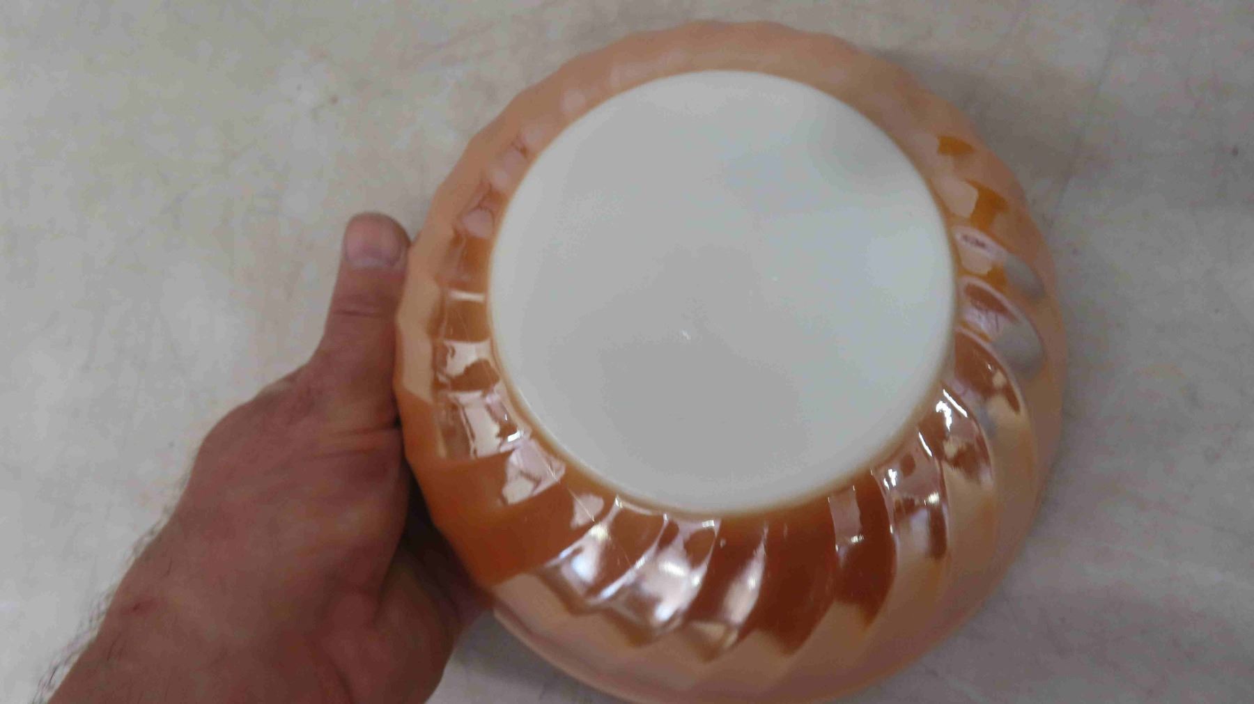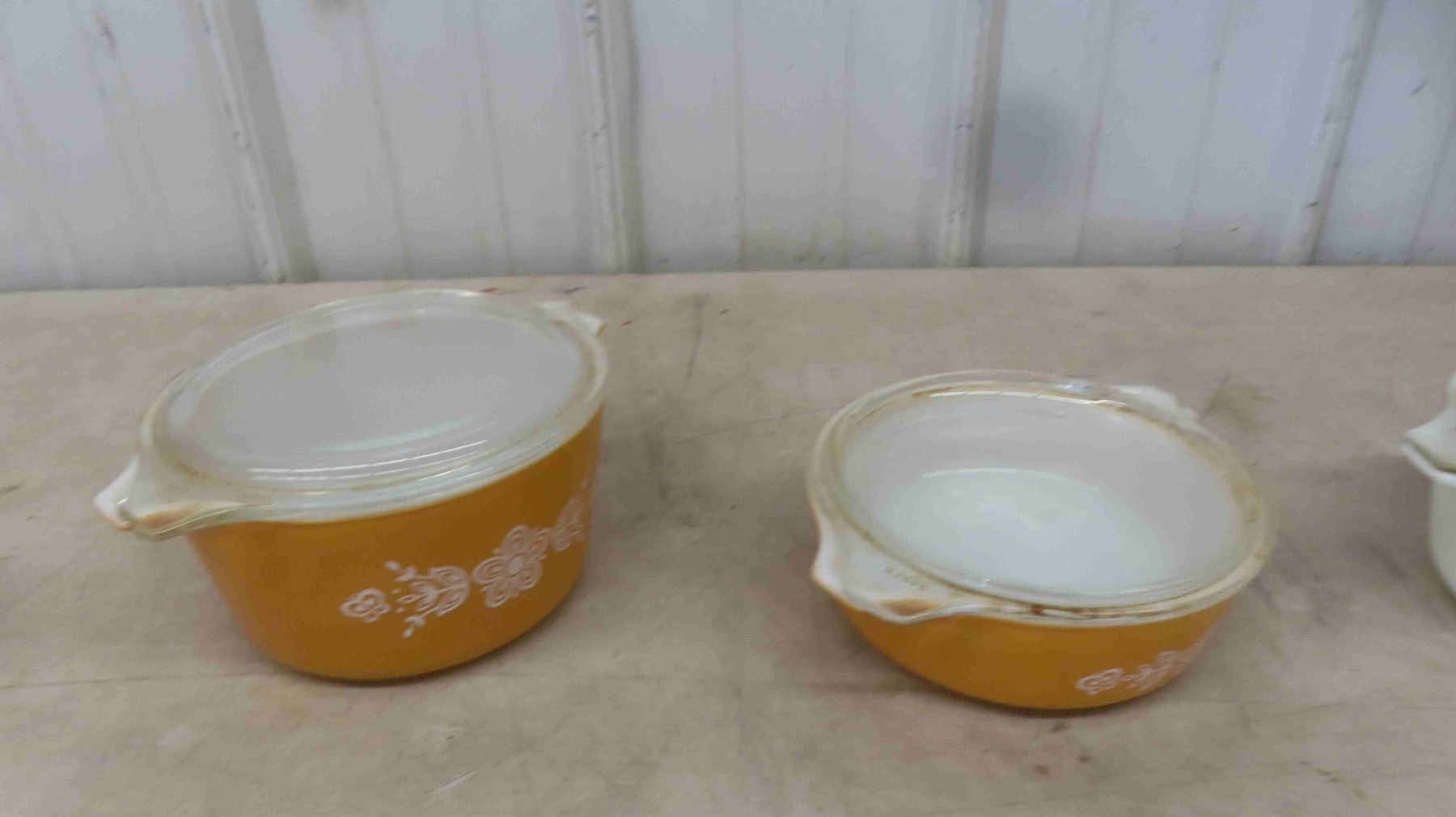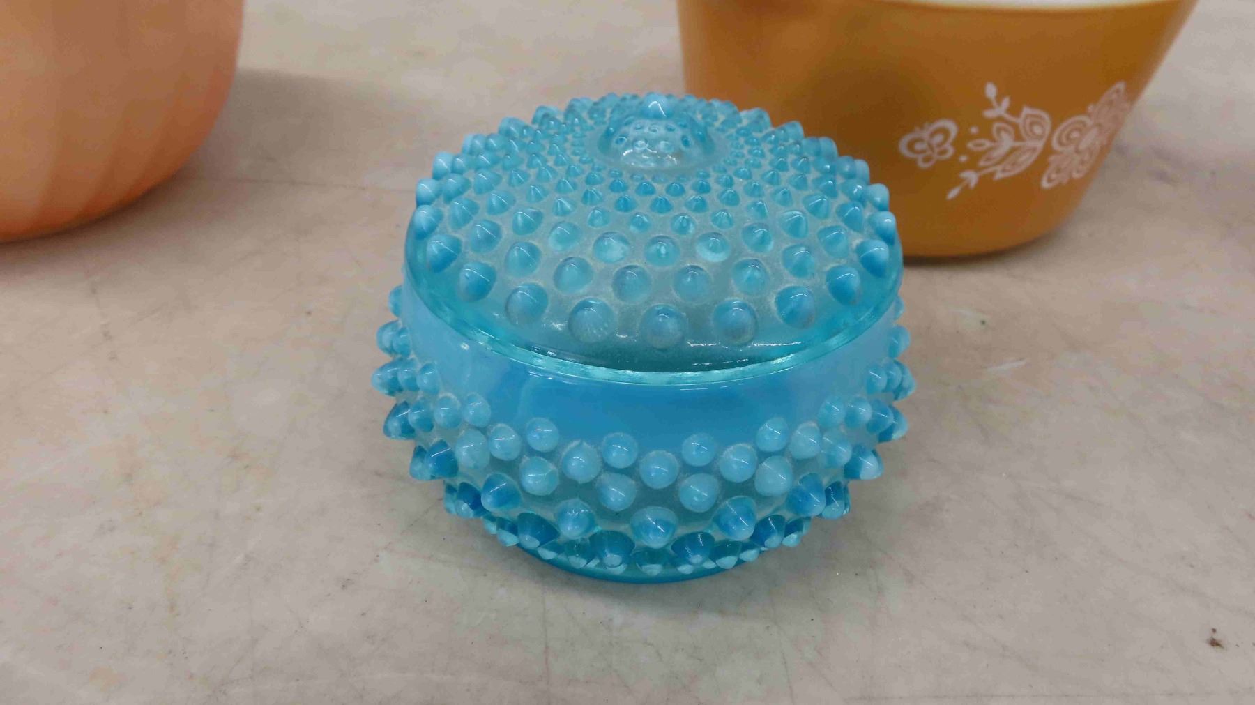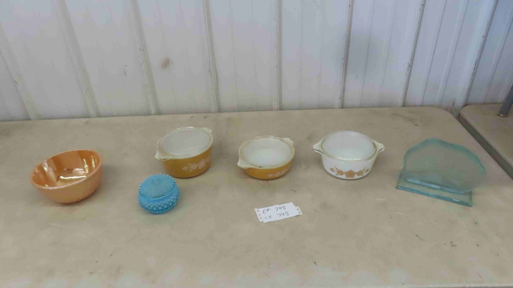 3 Pyrex Casseroles with Lids , Fire King Mixing Bowl , Fenton Dish, Etched Glass