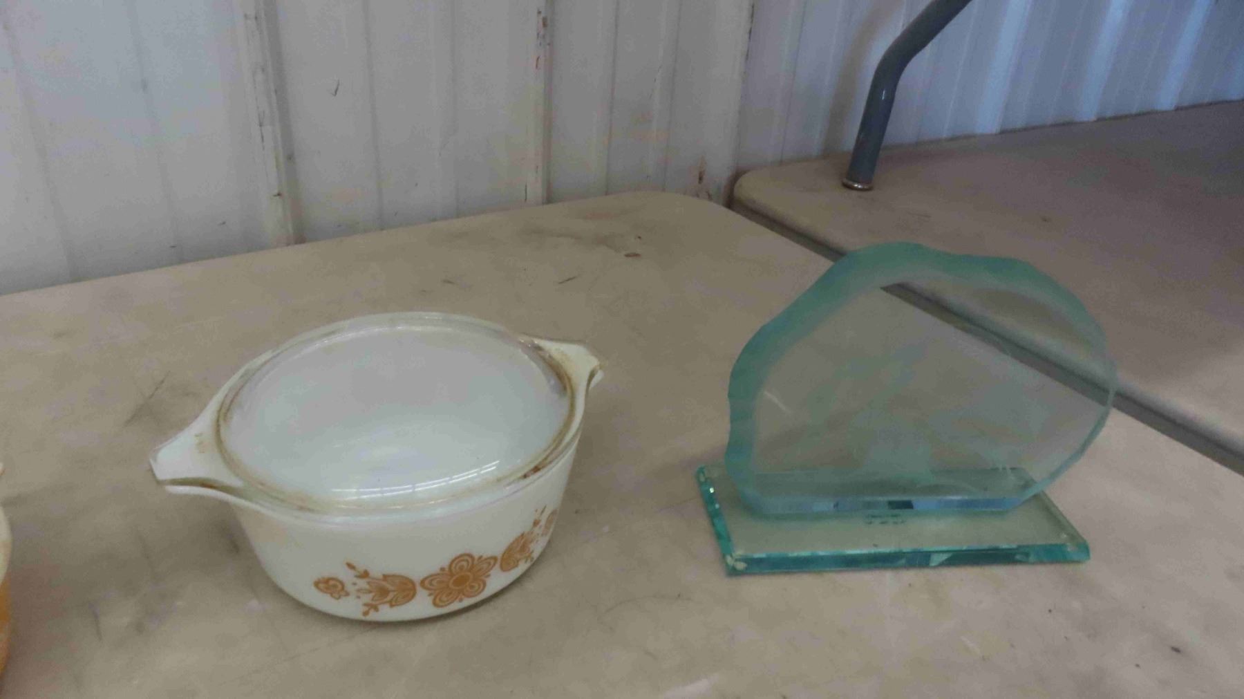 3 Pyrex Casseroles with Lids , Fire King Mixing Bowl , Fenton Dish, Etched Glass Display