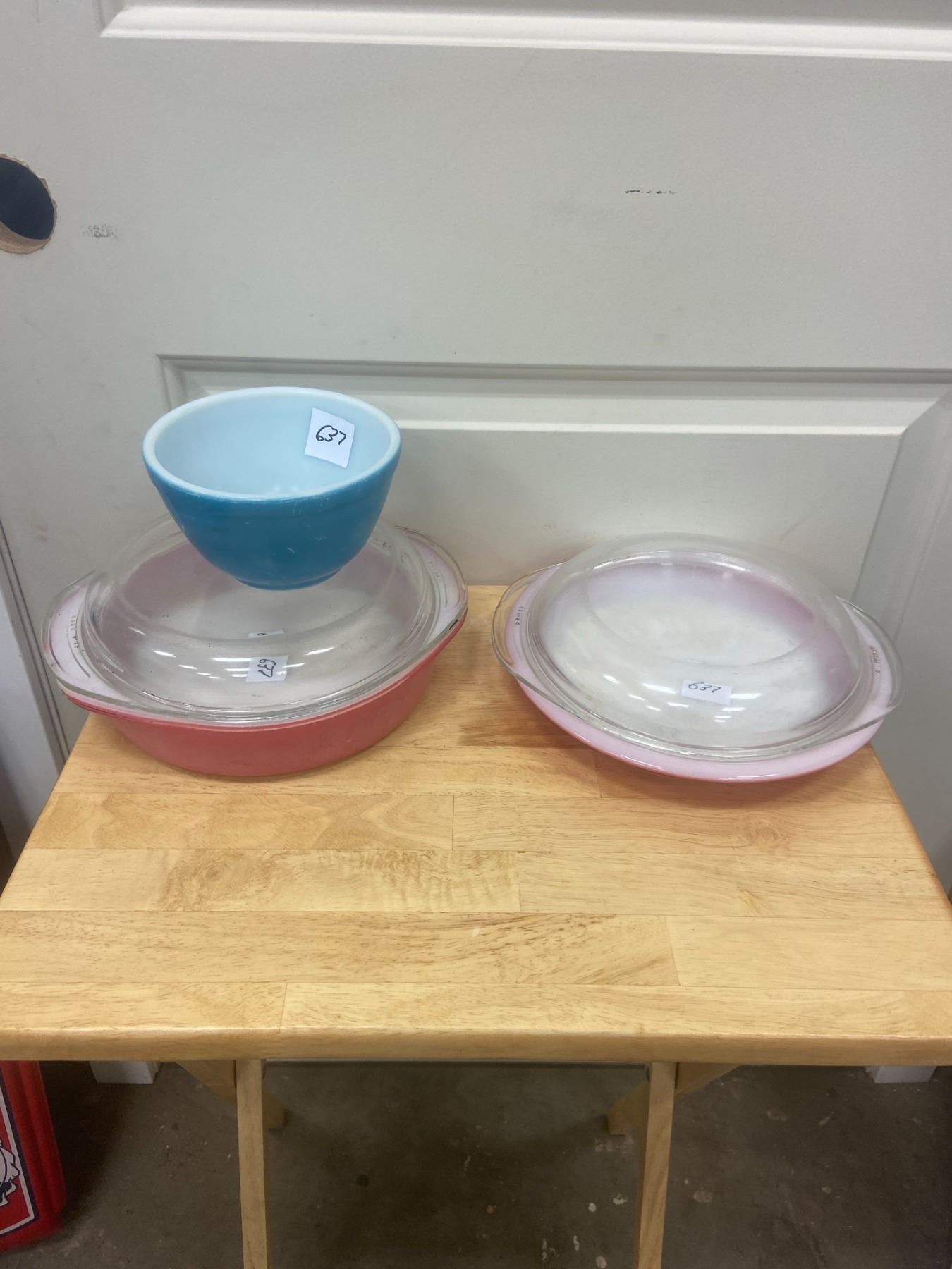 (3) Pyrex Pc's 2-Pie platters + Lids and bowl