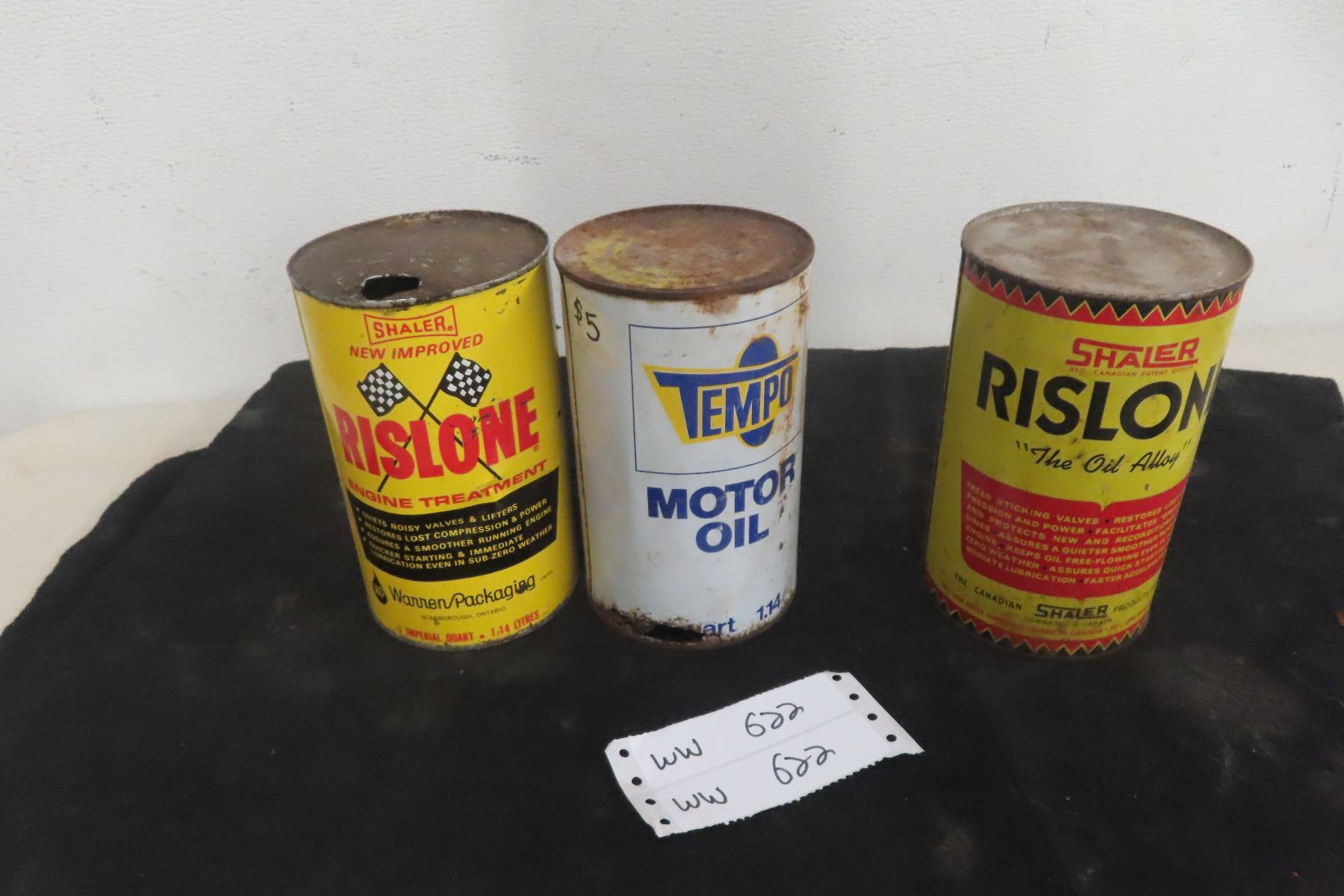 3 Quart Oil Cans - 2 Shaler Rislone (1 with product) and 1 Tempo