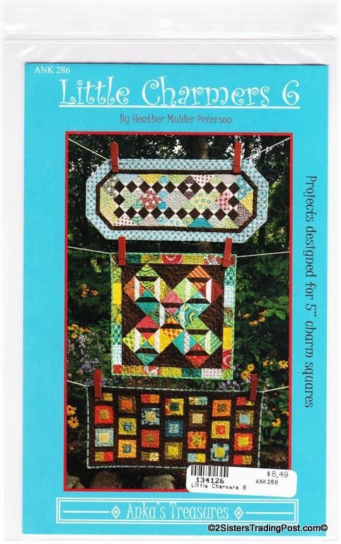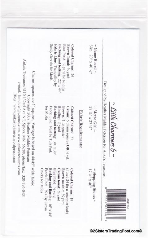 Pattern #ANK286 'Little Charmers 6' designed by Heather Mulder Peterson for Anka's Treasures. Each project is designed for 5" charm squares. 1:Game Board 20" x 40.5" 2:Metro Girl 27.125" x 27.125" 3:Stepping Stones 17.25" x 40" MSRP $8.49