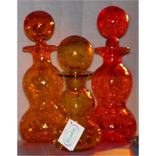 SET OF 3 FOR ONE PRICE. MAGNIFICENT COMPLETE DISPLAY OF VIBRANT SPARKLING EARTH TONE CRACKLE GLASS RAINBOW GLASS COMPANY 7461 GURGLE DECANTERS.</em></td>