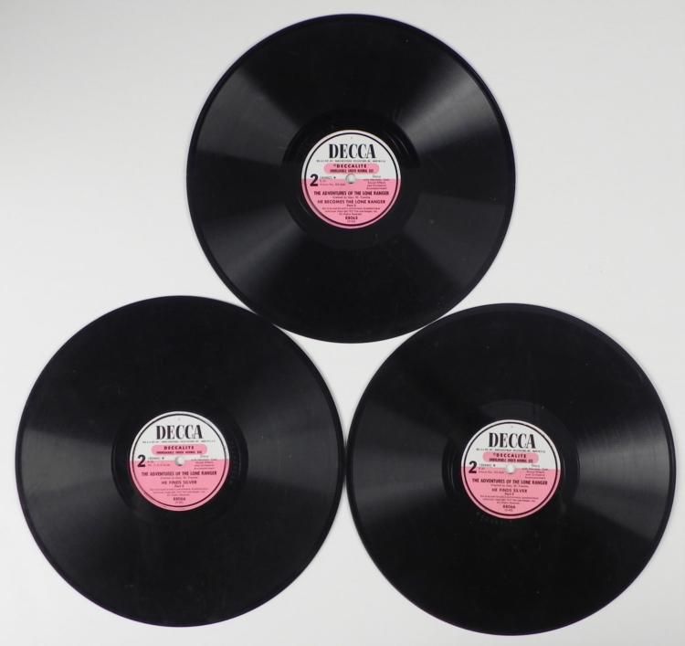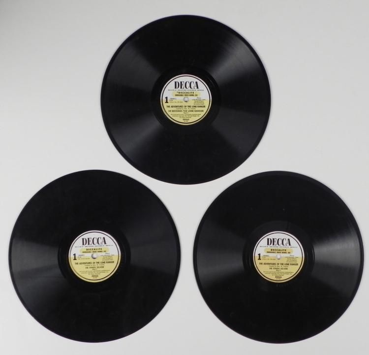 3 78 RPM FROM 1951 OF THE "LONE RANGER"-DECCA-THE ADVENTURES OF THE LONE RANGER * * INCLUDES-"HE FINDS SILVER"-PART 1&2 (2 COPIES)--"HE BECOMES THE LONE RANGER"PART 1&2---SOME WEAR & SCRATCHES *