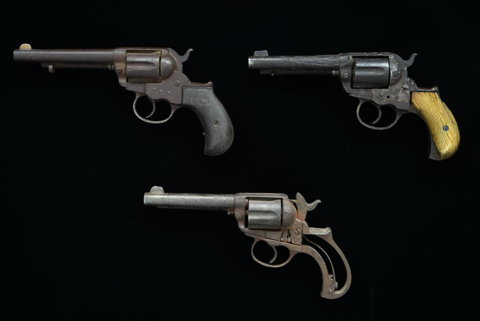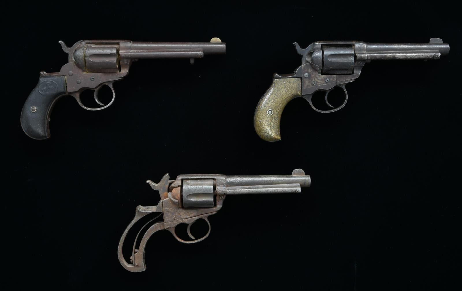 REVOLVERS. 1 Thunderer and 2 Lightning models. Thunderer exhibits oxidation and pitting overall. Grips are not present. 1 Lightning model with checkered hard rubber grips and the other with period horn grips. 1 Lightning's front sight has been replaced with a brass blade front sight, with the other having the top of its original front sight shaved down. CONDITION: metal components exhibit heavy pitting and retain dark patinas overall. Horn grips exhibit cracking and bear losses to the elft panel. 1 Lightning bears losses to the metal overall. PROVENANCE: From the Lifelong Collection of Glen E. Mattox. (01-22599/MLW). $500-800.