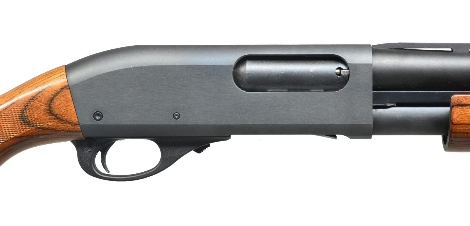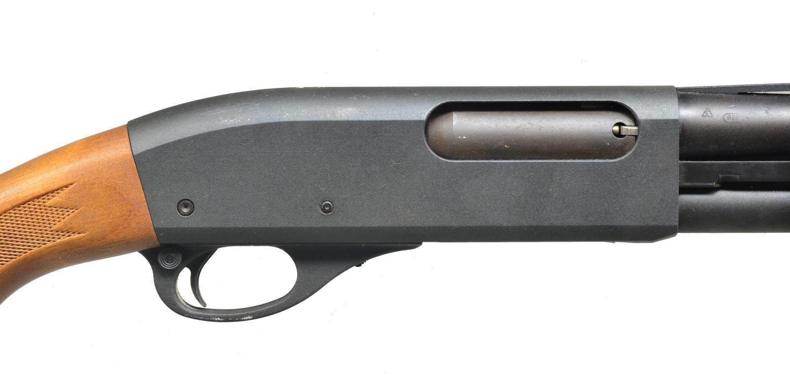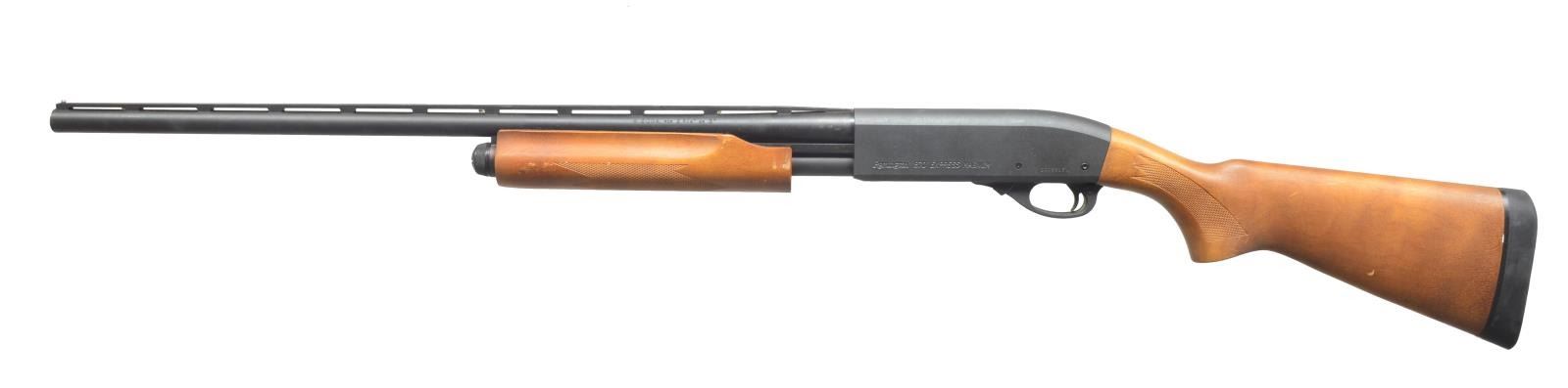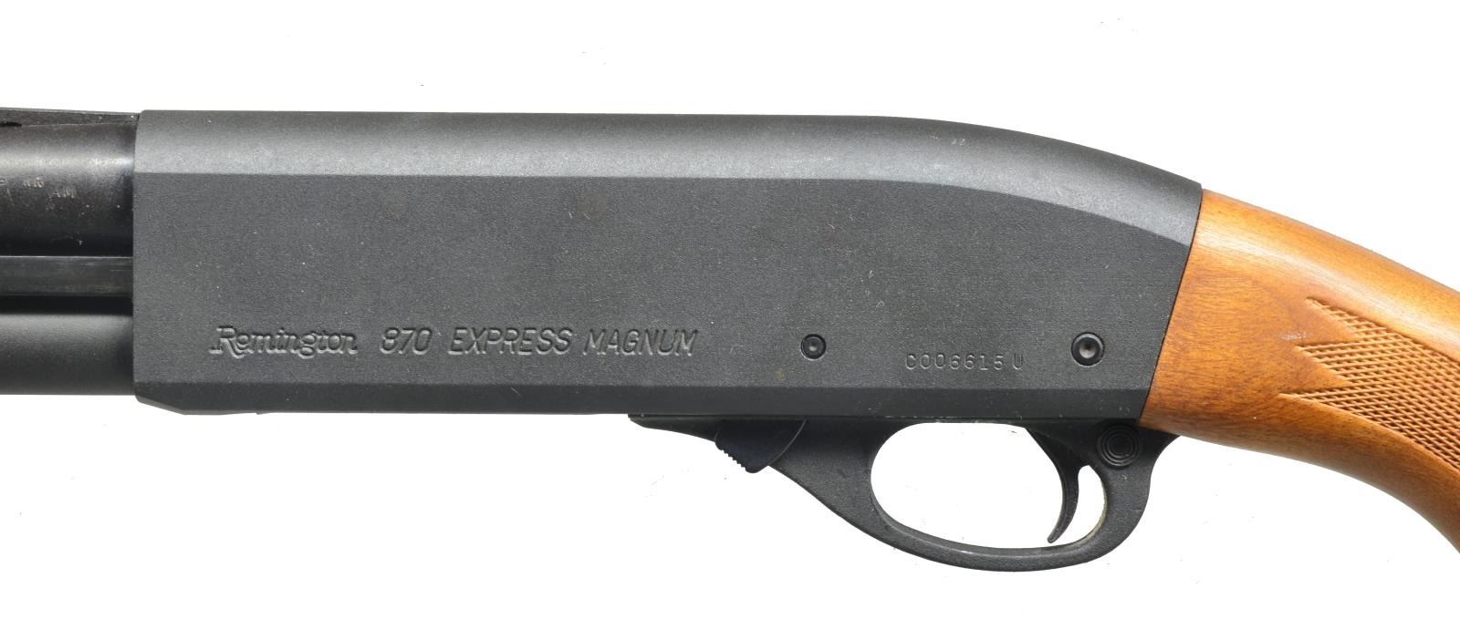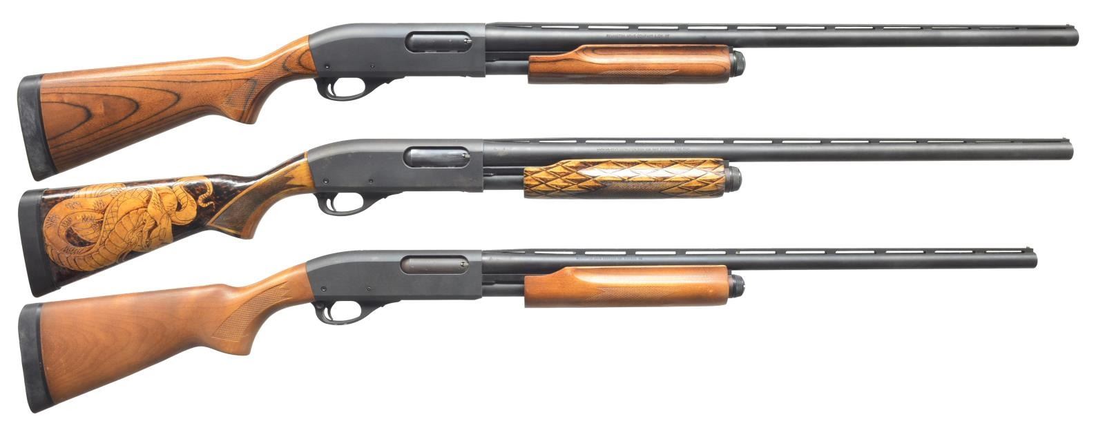 1) Cal. 12 Ga. Mag., 3 1/2". S# RS52350R. Bbl. 28” vent rib bbl. w/ Rem choke. Choke is bbl. is modified. Laminated checkered forend. Laminated checkered pistol grip stock w/ carved “R” in grip cap & solid black Remington recoil pad. CONDITION: bbl. retains most of its original matte finish w/ minor scratches near muzzle. Receiver has most of its original matte finish w/ a minor scratch on left side. Forend has original finish w/ minor handling marks & slightly worn checkering. Buttstock has original finish w/ a few sm. rub marks & slightly worn checkering. Bore is good. (20-3486/BT). 2) Cal. 20 Ga. Mag., 3". S# C006615U. Bbl. 25 1/2” vent rib. Bbl. is equipped w/ Rem choke. Left side of receiver is marked “REMINGTON 870 EXPRESS MAGNUM”. Standard checkered forend, checkered pistol grip & solid black Remington recoil pad. CONDITION: bbl. retains most of its original matte finish Receiver has most of its original matte finish w/ a couple minor scratches. Forend has original finish w/ 3 or 4 minor chips. Good checkering. Stock has original finish w/ a minor dent on lower left side. Some hand wear in grip area & good checkering. Bore is bright. (20-3487/BT). 3) Cal. 12 Ga., 3". S# B098631M. Bbl. 28” VR w/ Rem. chokes. Left side of receiver marked “REMINGTON 870 EXPRESS MAGNUM”. Customized forend that has original checkering & a series of diamonds that have been stained dark. Buttstock is checkered pistol grip w/ artwork of a snake on right side & a woman’s face w/ snakes as hair on left. Dark staining, mostly as background to the 2 figures. “RH” carved in grip cap. CONDITION: bbl. retains most of its original matte finish w/ a couple sm. scuff marks. Receiver has most of its original matte finish w/ minor surface oxidation. Forend & buttstock are solid. Shiny bore. (20-3489/BT). ALL MODERN. $900-1,400.