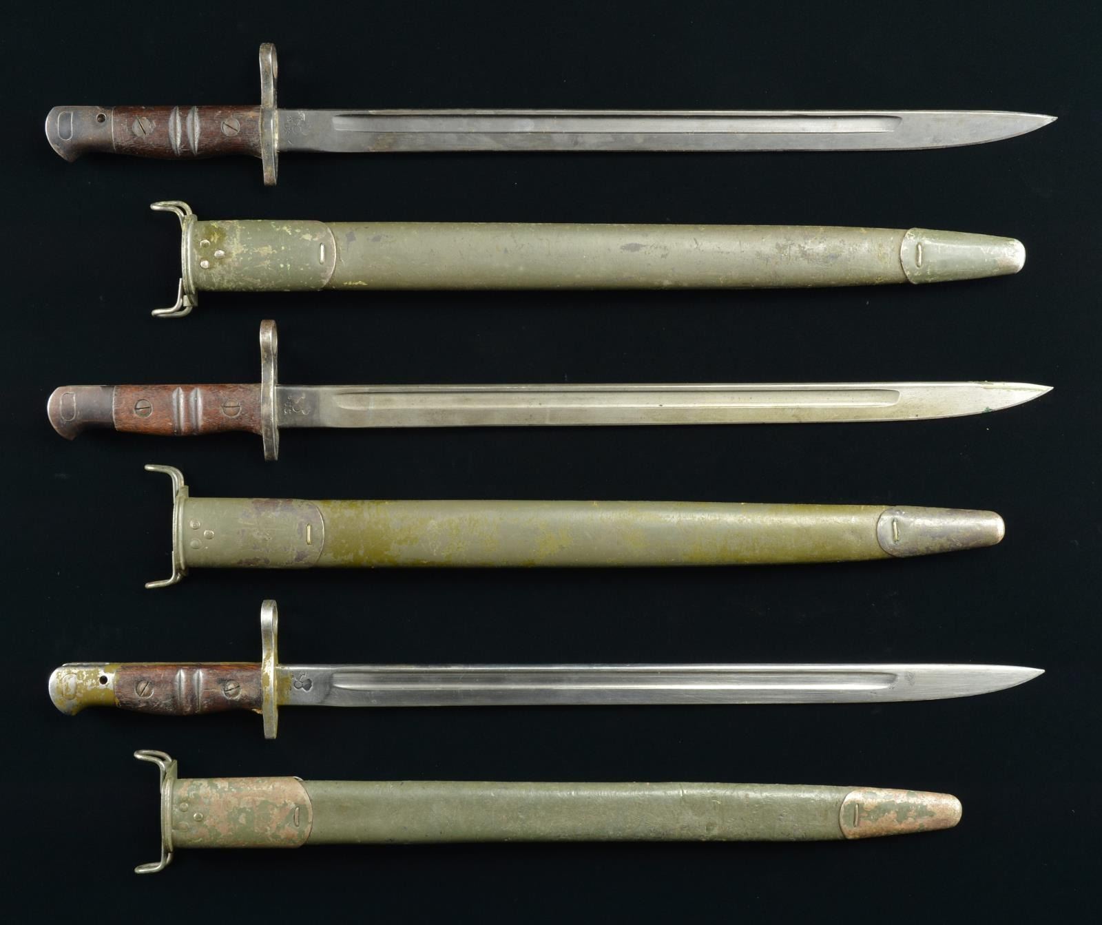 3) Blued finish on bayonet. Ricassos marked w/ eagle "29" proof & "1917" date. CONDITION: good overall w/ patina & edge wear on metal. Good intact grips w/ a few gouges. Good intact scabbard w/ flaking finish & areas of patina. (02-17432-2/MD). $400-600.