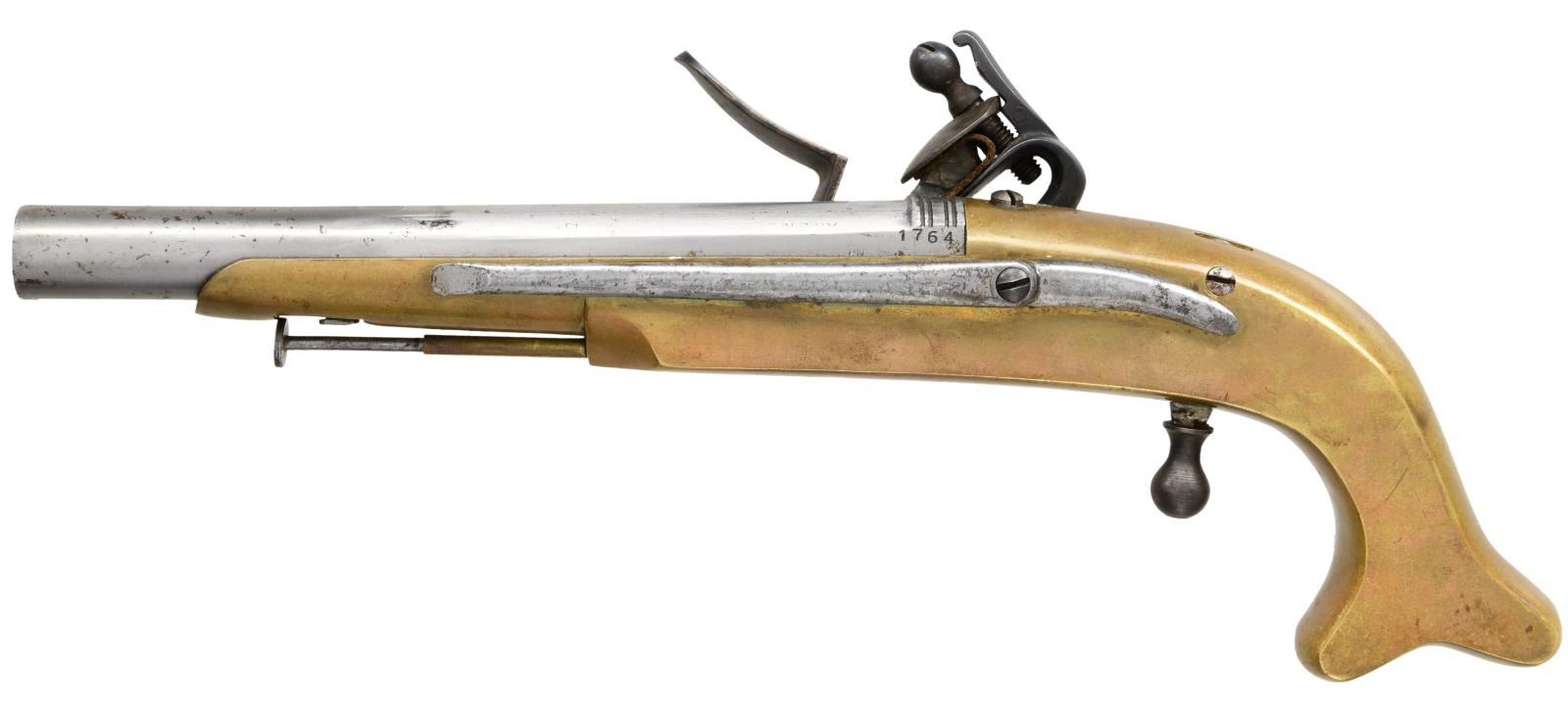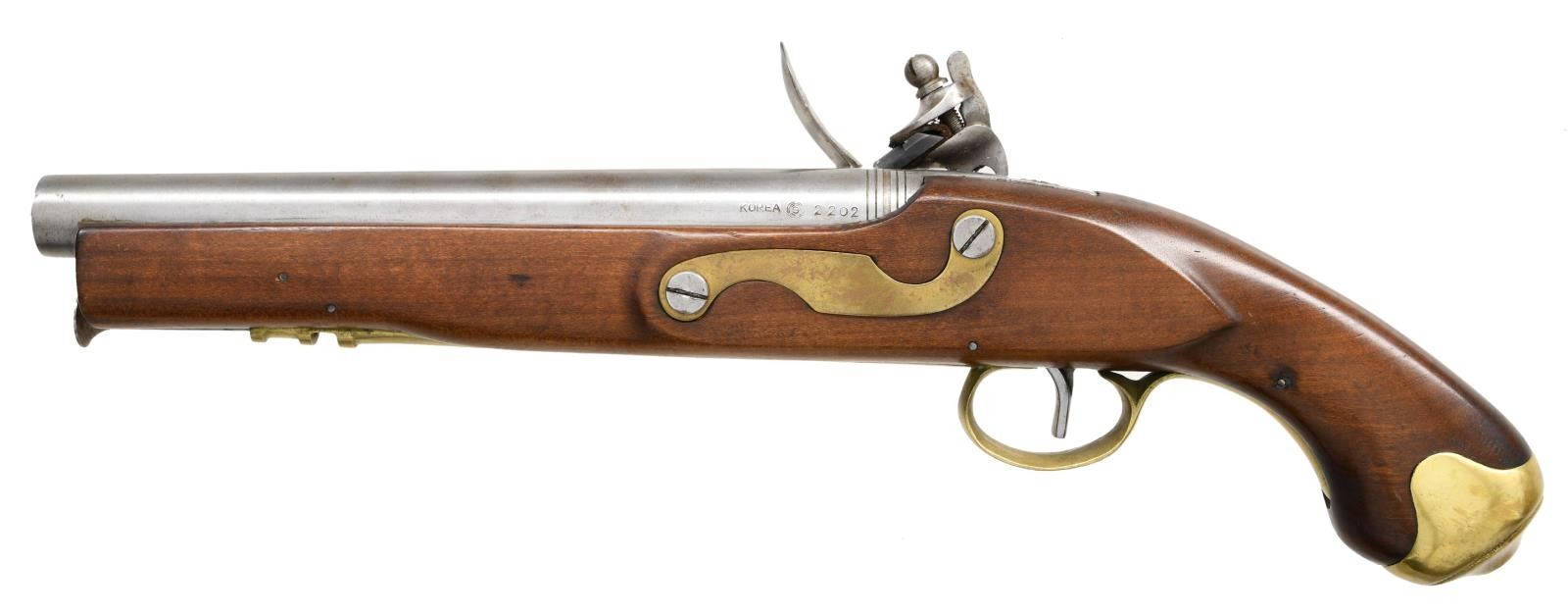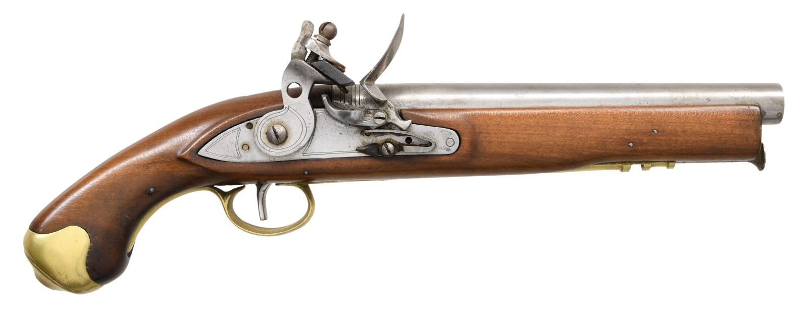 1) ITALIAN REPRODUCTION BRASS FRAME FLINTLOCK PISTOL. Cal. .60. S# 1764. Bbl 7 1/8". Brass frame w/ case color hardened lockplate, and still bbl. Italian markings on left side of bbl have been mostly scrubbed. CONDITION: Brass frame retains a mottled patina. Bbl shows scattered spots of oxidation and discoloration. Case color hardened sideplate shows some scattered oxidation overall. (01-23620/MLW). 2) SAR ARMS TOWER FLINTLOCK PISTOL. Cal. 70. S# T455. Bbl. 9". Turkish made repro of a Tower flintlock pistol. Center of lock has British crown over "GR" marking. Rear of lock is marked "SAR". Brightly finished bbl, lock, hammer, frizzen & ramrod. Brass fittings. Walnut stock. CONDITION: stock shows scattered handling wear & flaking varnish. Brass parts show scattered light scratches & handling wear. Bright parts show scattered oxidation staining. Good bright bore. (01-23649/MJC). 3) KOREAN REPRO FLINTLOCK PISTOL. Cal. 69. S# 2202. Bbl. 9". Korean made repro of flintlock pistol. Left sid eof bbl. marked "KOREA" w/ an unknown logo & "2202". Brightly finished bbl., ramrod, upper tang & lock assembly. Brass fittings. Beech stock. CONDITION: stock has some light chipping on grip area, some dings near grip cap & scattered handling wear. Brass parts show scattered light oxidation staining & handling wear. Bright parts are turning gray w/ scattered light oxidation. (01-23657/MJC). ALL ANTIQUE. $300-600.