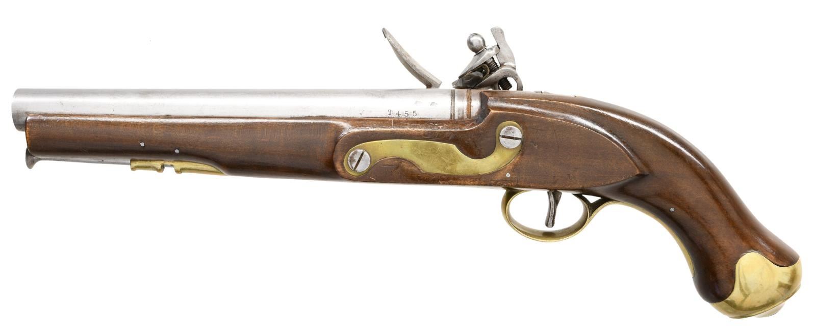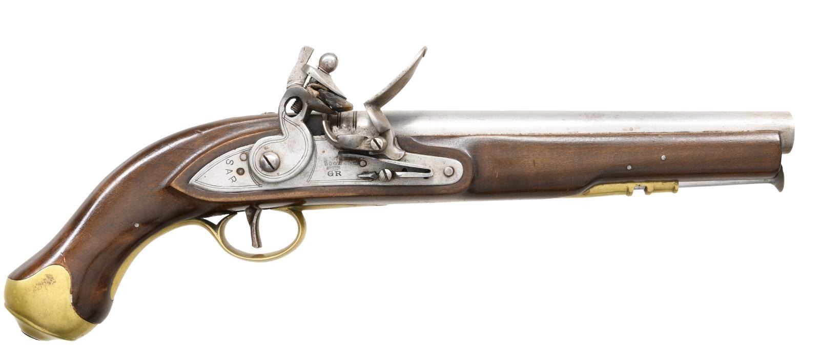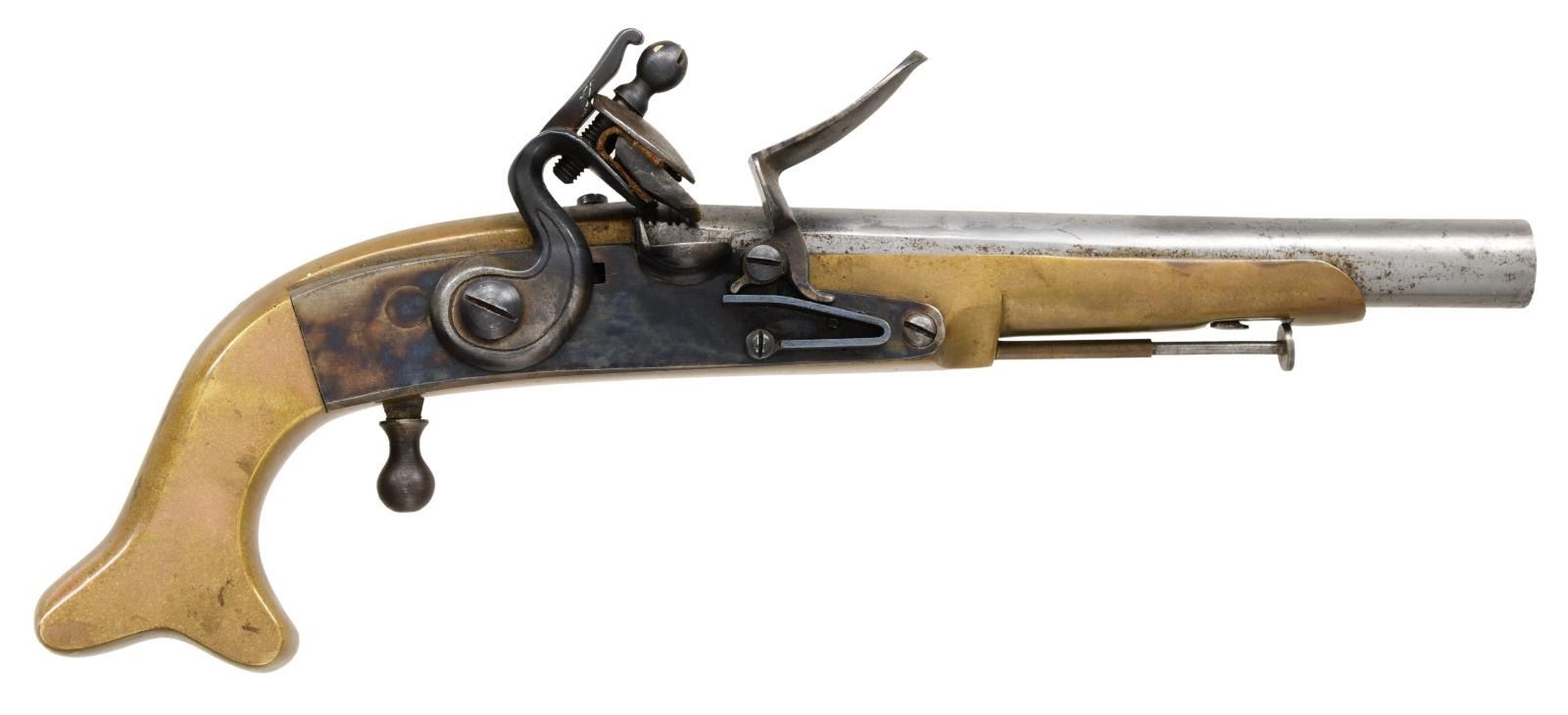 1) ITALIAN REPRODUCTION BRASS FRAME FLINTLOCK PISTOL. Cal. .60. S# 1764. Bbl 7 1/8". Brass frame w/ case color hardened lockplate, and still bbl. Italian markings on left side of bbl have been mostly scrubbed. CONDITION: Brass frame retains a mottled patina. Bbl shows scattered spots of oxidation and discoloration. Case color hardened sideplate shows some scattered oxidation overall. (01-23620/MLW). 2) SAR ARMS TOWER FLINTLOCK PISTOL. Cal. 70. S# T455. Bbl. 9". Turkish made repro of a Tower flintlock pistol. Center of lock has British crown over "GR" marking. Rear of lock is marked "SAR". Brightly finished bbl, lock, hammer, frizzen & ramrod. Brass fittings. Walnut stock. CONDITION: stock shows scattered handling wear & flaking varnish. Brass parts show scattered light scratches & handling wear. Bright parts show scattered oxidation staining. Good bright bore. (01-23649/MJC). 3) KOREAN REPRO FLINTLOCK PISTOL. Cal. 69. S# 2202. Bbl. 9". Korean made repro of flintlock pistol. Left sid eof bbl. marked "KOREA" w/ an unknown logo & "2202". Brightly finished bbl., ramrod, upper tang & lock assembly. Brass fittings. Beech stock. CONDITION: stock has some light chipping on grip area, some dings near grip cap & scattered handling wear. Brass parts show scattered light oxidation staining & handling wear. Bright parts are turning gray w/ scattered light oxidation. (01-23657/MJC). ALL ANTIQUE. $300-600.
