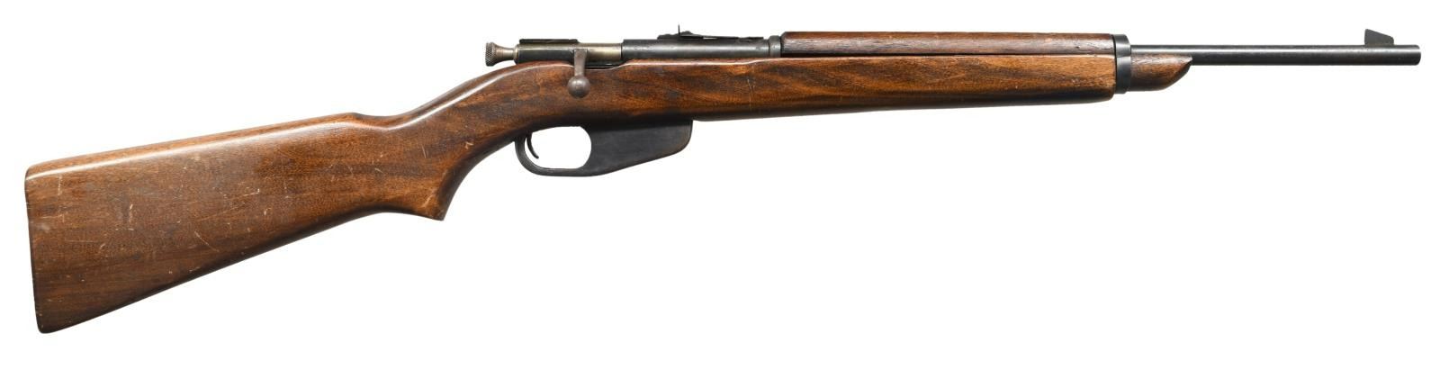 1) UNMARKED SINGLE SHOT FLOBERT PARLOR RIFLE. Cal. 22 RF. S# 6374. Bbl 22 1/2". Dark gray patina with 1 piece wood buttstock. Stock appears to have been light sanded and revarnished at one time. Full length octagonal. Front and rear sights are homemade replacements. CONDITION: metal components exhibit a dark gray patina, w/ scattered spots of pitting present overall. Dark bore, exhibiting pitting throughout. Stock bears some scattered marks from handling, w/ sizeable repaired cracks on either side of the forend. (23-1906/MLW). CURIO. 2) PIETTA SOVEREIGN .22 LR BOLT ACTION RIFLE. Cal. .22 LR. S# 5174. Bbl 18-1/2". Blued finish with a solid 1-piece wood stock. Old adhesive on the left and right sides of the buttstock. Italian proofs on left of receiver and barrel. CONDITION: Metal components retain the majority of their blue finish, exhibiting light wear and light surface oxidation overall. Bright bore, exhibiting strong rifling. Stock exhibits some scattered marks and impressions from handling and storage. (23-2017/MLW). MODERN. 3) HOBAN BOLT ACTION RIFLE. Cal. 22 S, L & LR. NSN. Bbl. 20". Military style "Boys rifle" partly resembling an M1 Carbine. Single shot bolt action. Elevator adj. rear sight. Blade front sight. Hardwood pistol grip stock & handguard. CONDITION: stock set has added finish w/ scattered flaking, scratches & handling wear. Metal retains 40% original blue w/ scattered oxidation. Fair bore w/ scattered oxidation. (23-2022/MJC). CURIO. $200-450.