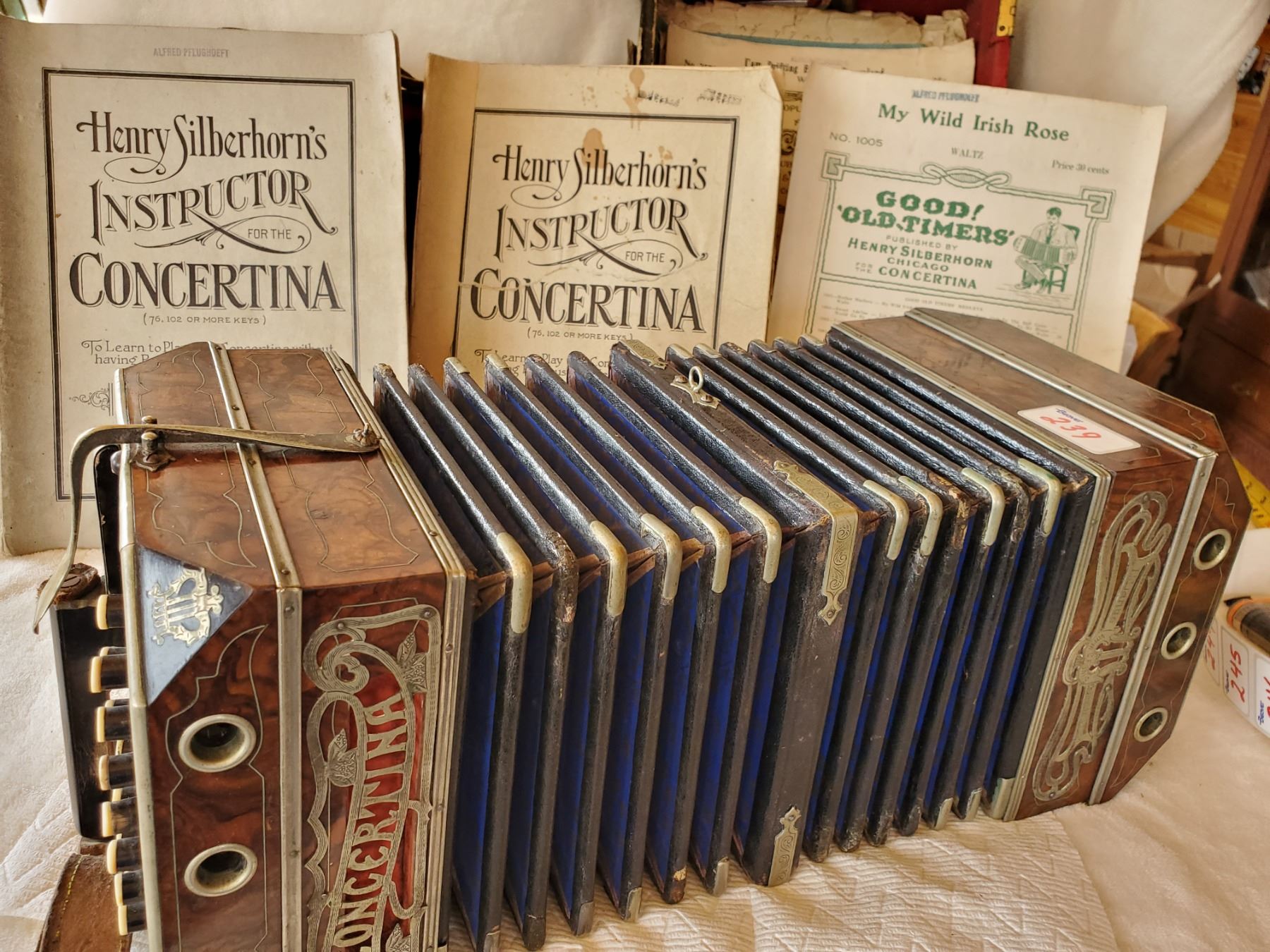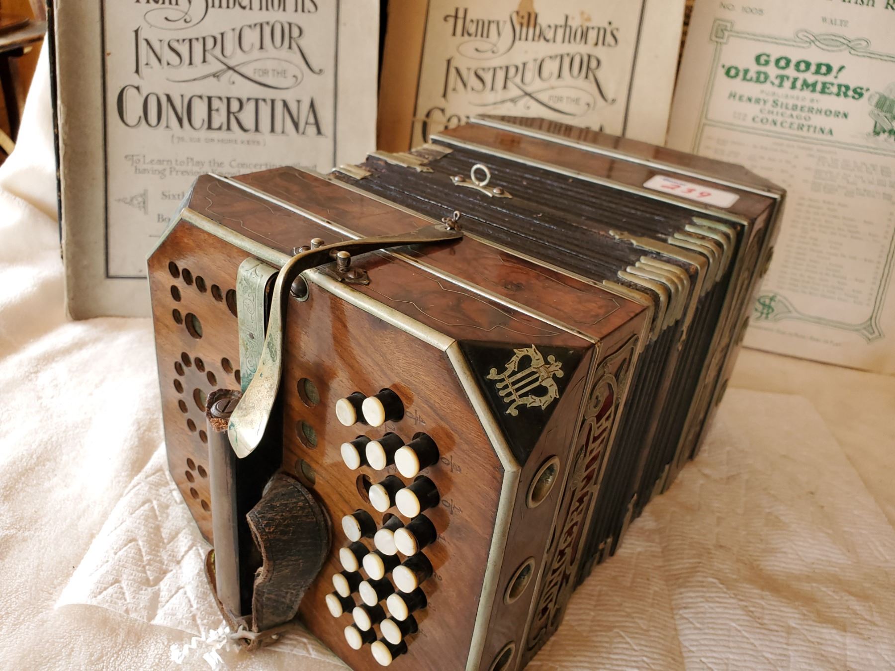 3 ROW BUTTON ACCORDIAN CONCERTINA WITH BOOKS. BELLOW GOOD-1 BUTTON & 1 CAP MISSING*STILL EXCELLENT*