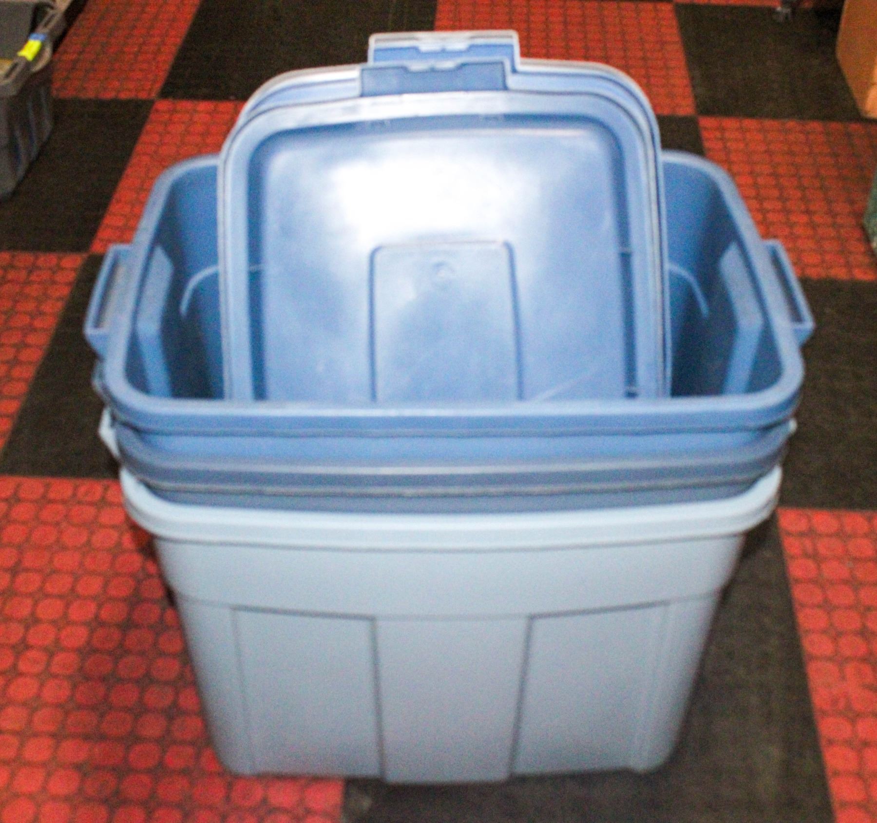 3 RUBBERMAID 78L TUBS WITH LIDS ASSORTED COLOURS