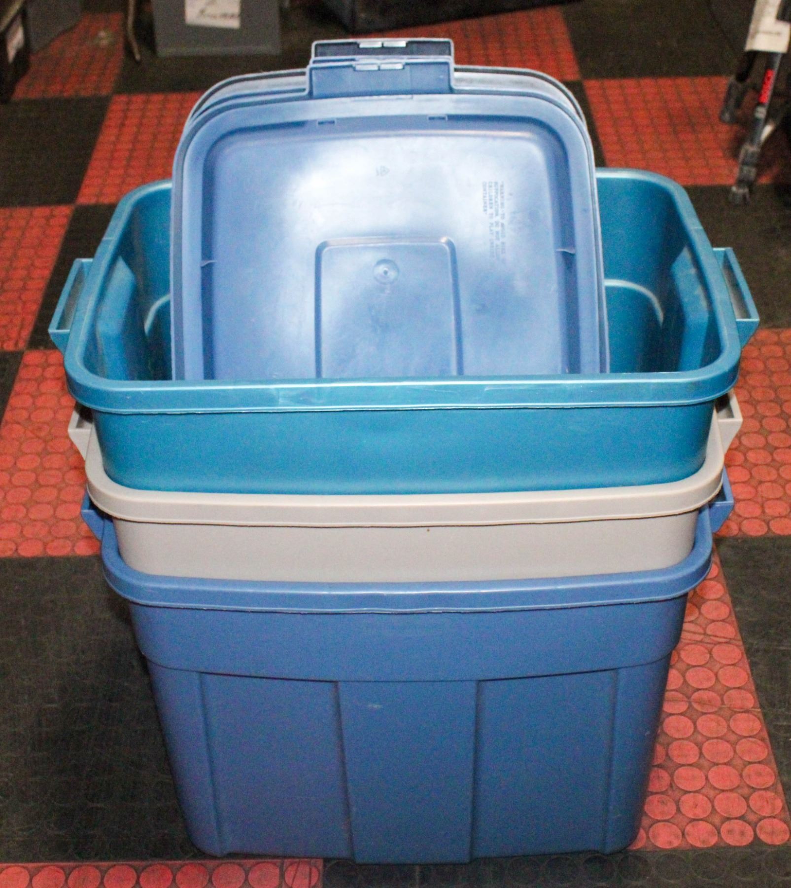 3 RUBBERMAID 78L TUBS WITH LIDS ASSORTED COLOURS