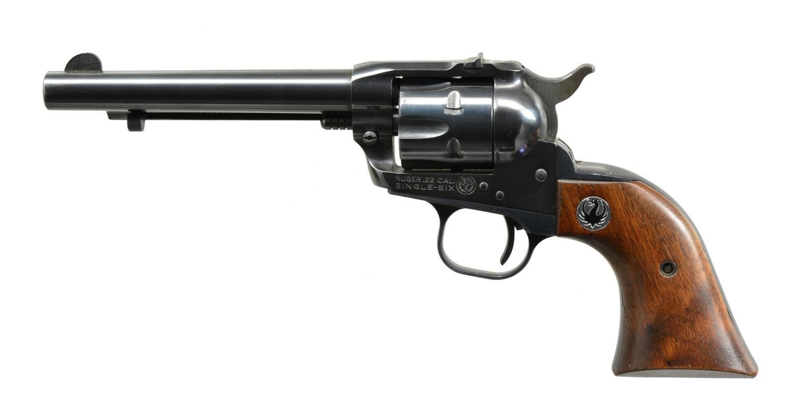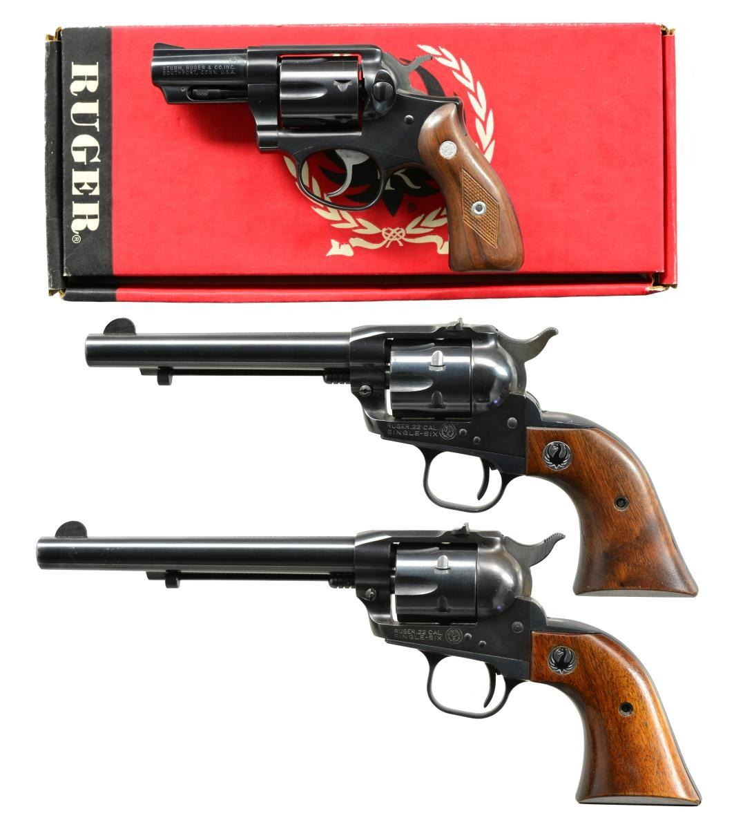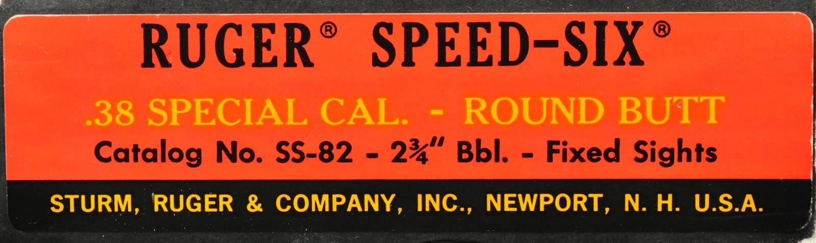 1) SPEED-SIX. Cal. 38 Spl. S# 151-61299. Bbl. 2 3/4". Mfg. 1975 (no warning marks) w/ catalog #SS-82 having fixed sights & rnd. butt. Checkered walnut grips w/ silver medallions. UNATTACHED ACCESSORIES: near excellent 1 piece red box w/ packaging. CONDITION: hint of cyl. turn line & firing residue; generally all aspects near excellent including bore. (20-1517/NW). MODERN. 2) SINGLE-SIX. Cal. 22 LR / 22 Mag. S# 340882. Bbl. 6 1/2". Mfg. 1962 w/ XR3-RED frame having walnut grips & black eagle medallions. Type 1 convertible having last 3 digits stamped on LR cyl. face. Additional Type 1 charactistic of steel ejector rod housing. Standard fixed sights. Catalog #RSSMX; about 7000 mfg. Has not been factory safety updated. UNATTACHED ACCESSORIES: very good mag. cyl. unmarked but proper fit & function. Light scratches on rear face. Red felt bag & beige original cyl. box. CONDITION: very faint wear at muzzle along w/ some pinprick oxidation. All other aspects near excellent including bore. (20-1521/NW). CURIO. 3) SINGLE-SIX. Cal. 22 LR / 22 Mag. S# 368587. Bbl. 5 1/2". Mfg. 1963 w/ XR3-RED frame having walnut grips & black eagle medallions. Type 3 convertible having last 3 digits electro engraved on LR cyl. face. Additional Type 3 charactistic of alloy ejector rod housing. Standard fixed sights. Catalog #RSS5X; about 5000 mfg. Has not been factory safety updated. UNATTACHED ACCESSORIES: very good mag. cyl. electro numbered 761, proper fit & function. Light scratches on rear face. Red felt bag & light gray unmarked cyl. box. CONDITION: very faint wear at muzzle along w/ some pinprick oxidation plus slight staining on sides of hammer. All other aspects near excellent including bore. (20-1542/NW). CURIO. $900-1,300.