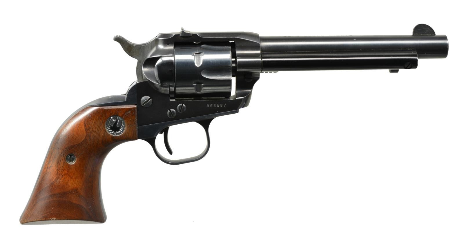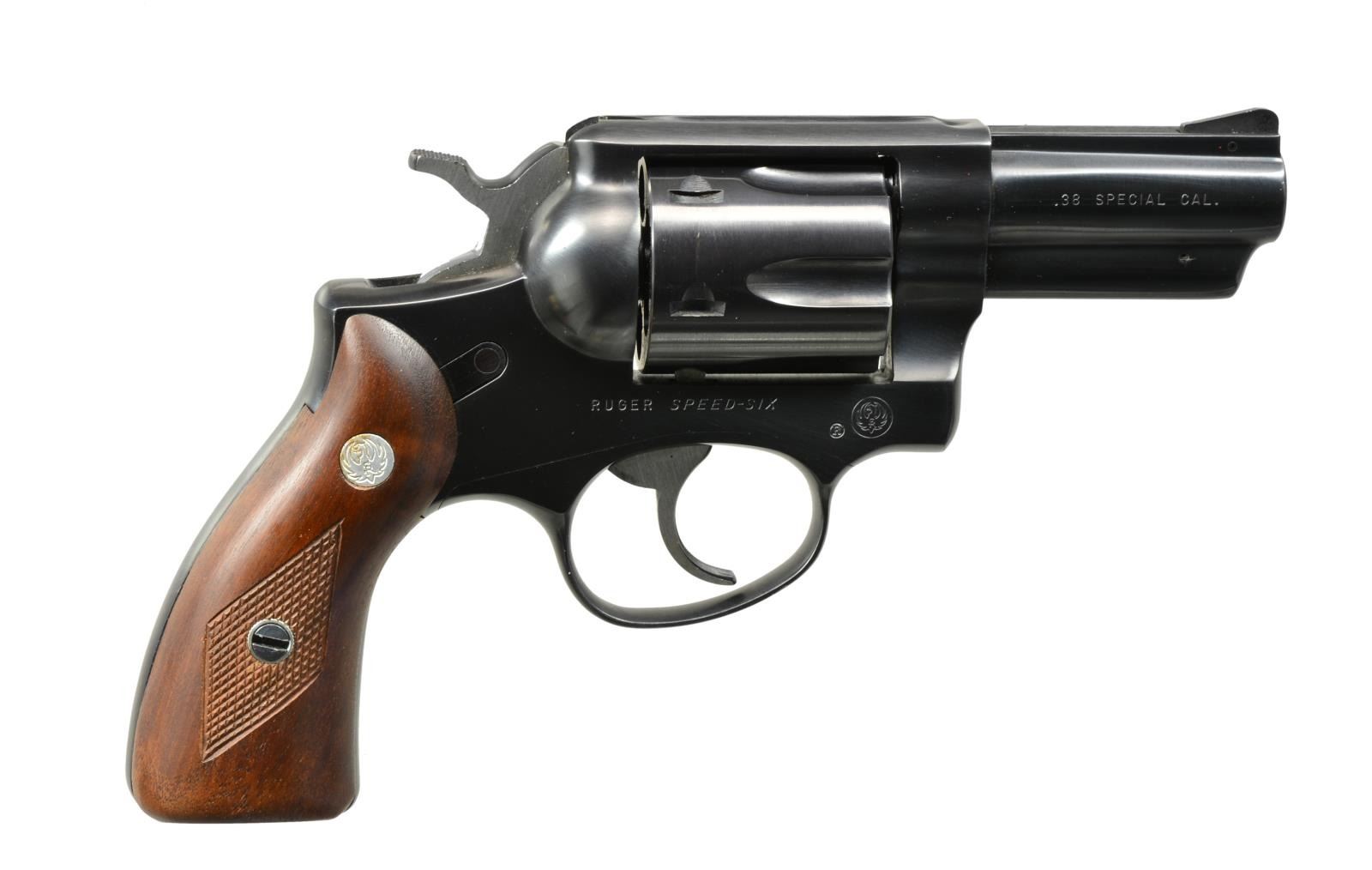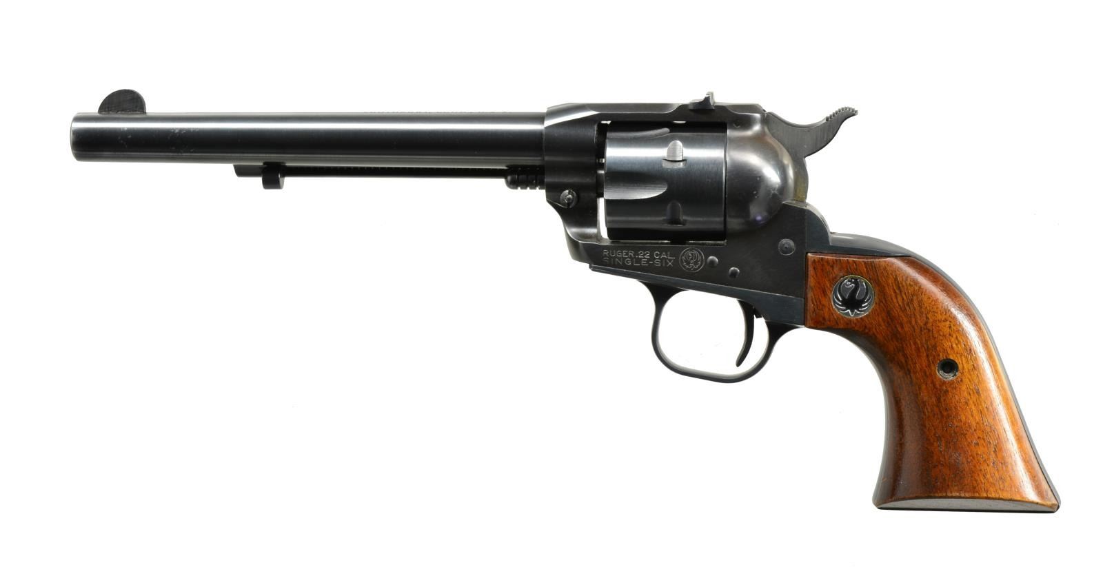 1) SPEED-SIX. Cal. 38 Spl. S# 151-61299. Bbl. 2 3/4". Mfg. 1975 (no warning marks) w/ catalog #SS-82 having fixed sights & rnd. butt. Checkered walnut grips w/ silver medallions. UNATTACHED ACCESSORIES: near excellent 1 piece red box w/ packaging. CONDITION: hint of cyl. turn line & firing residue; generally all aspects near excellent including bore. (20-1517/NW). MODERN. 2) SINGLE-SIX. Cal. 22 LR / 22 Mag. S# 340882. Bbl. 6 1/2". Mfg. 1962 w/ XR3-RED frame having walnut grips & black eagle medallions. Type 1 convertible having last 3 digits stamped on LR cyl. face. Additional Type 1 charactistic of steel ejector rod housing. Standard fixed sights. Catalog #RSSMX; about 7000 mfg. Has not been factory safety updated. UNATTACHED ACCESSORIES: very good mag. cyl. unmarked but proper fit & function. Light scratches on rear face. Red felt bag & beige original cyl. box. CONDITION: very faint wear at muzzle along w/ some pinprick oxidation. All other aspects near excellent including bore. (20-1521/NW). CURIO. 3) SINGLE-SIX. Cal. 22 LR / 22 Mag. S# 368587. Bbl. 5 1/2". Mfg. 1963 w/ XR3-RED frame having walnut grips & black eagle medallions. Type 3 convertible having last 3 digits electro engraved on LR cyl. face. Additional Type 3 charactistic of alloy ejector rod housing. Standard fixed sights. Catalog #RSS5X; about 5000 mfg. Has not been factory safety updated. UNATTACHED ACCESSORIES: very good mag. cyl. electro numbered 761, proper fit & function. Light scratches on rear face. Red felt bag & light gray unmarked cyl. box. CONDITION: very faint wear at muzzle along w/ some pinprick oxidation plus slight staining on sides of hammer. All other aspects near excellent including bore. (20-1542/NW). CURIO. $900-1,300.