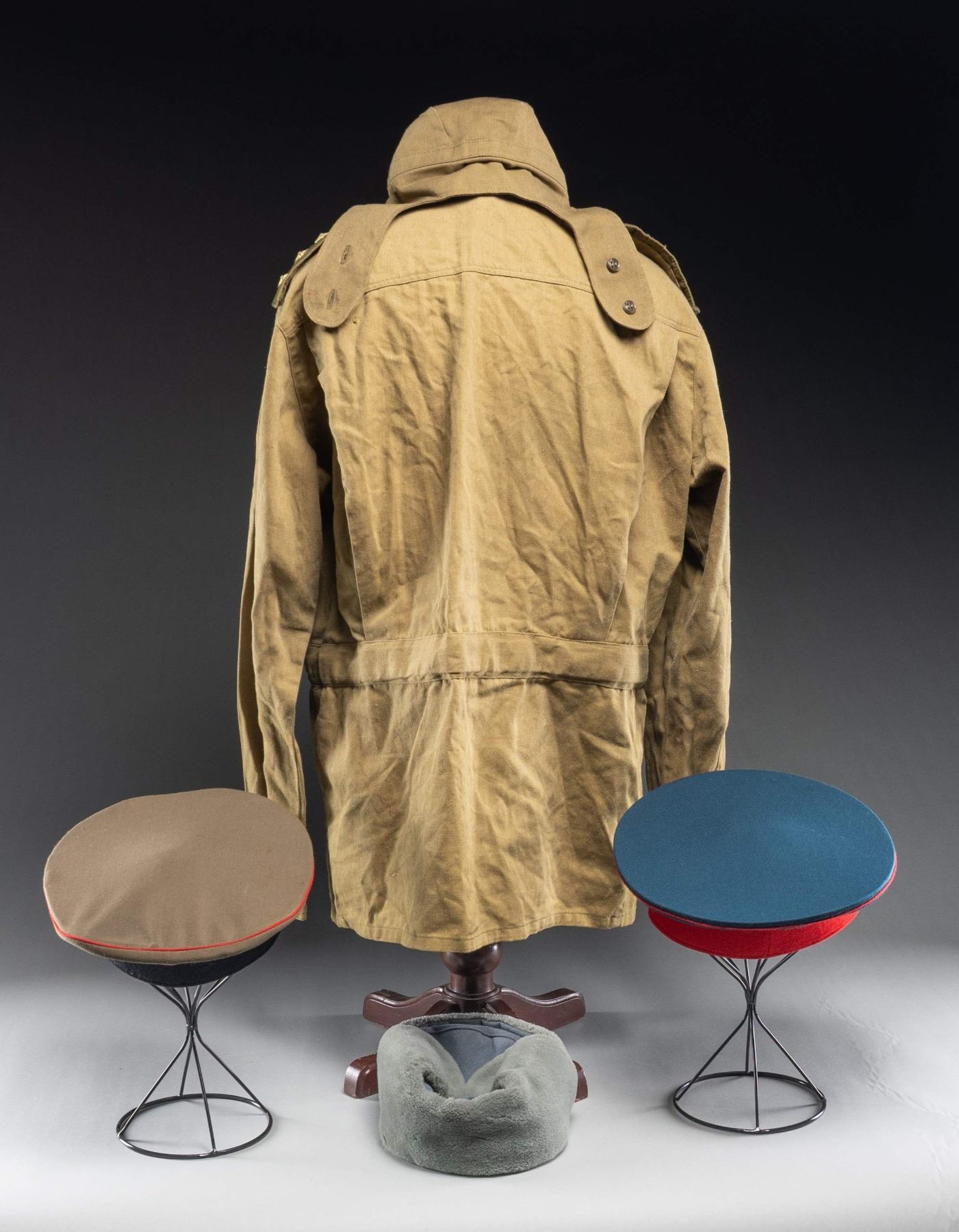 3 RUSSIAN MILITARY HATS, UNIFORM, AND BAYONET.