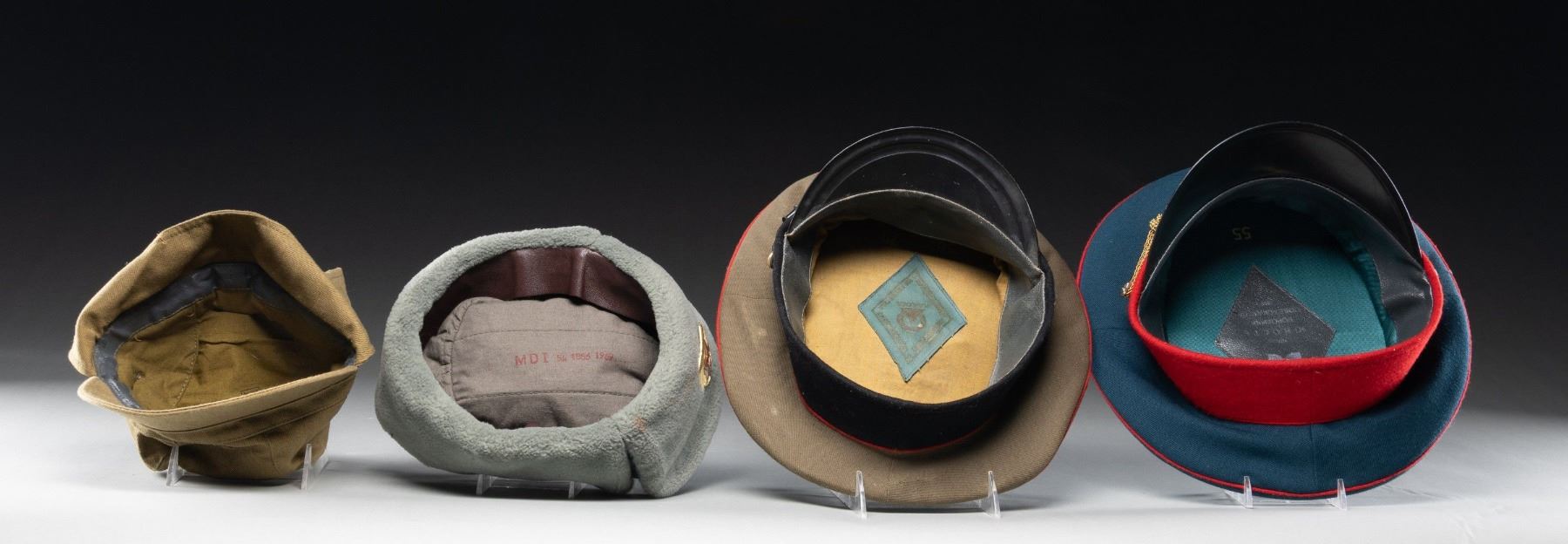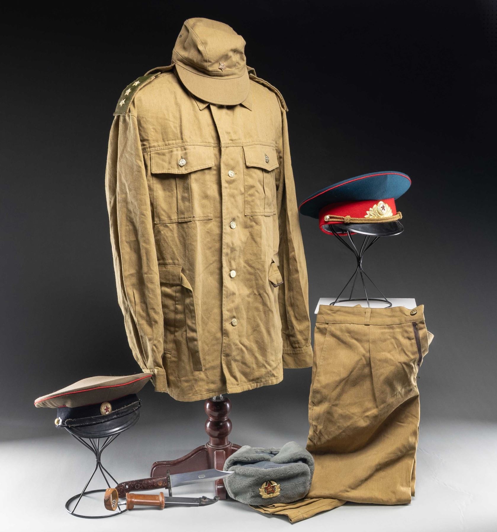 This lot contains 1 officer's visor cap with a blue/green crown and a red band. Officers chin strap and front plate. / 1 Enlisted visor cap with an OD crown and a black band. Enlisted chin strap and front plate. / 1 Winter hat in sage green wool with gold and red front plate. / 1 Field green/brown uniform and hat. The hat has ear flaps with a star on the front and the tunic has shoulder straps with 3 stars. Pants, tunic and hat match. / 1 Russian M1968 SVD bayonet & scabbard for the Dragunov rifle. CONDITION: all items show light wear overall. (02-24140/BF). NON-GUN. $300-600.