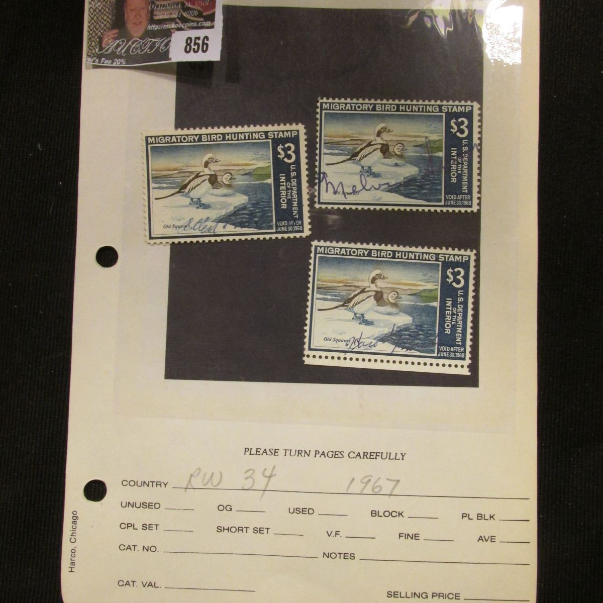 (3) RW34 1967 U.S. Department of Agriculture Migratory Bird Stamps, Fine, signed.