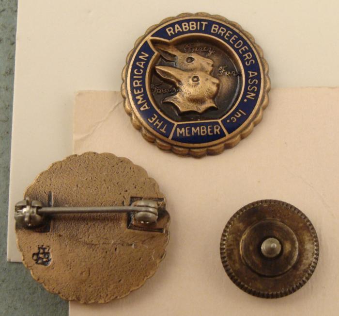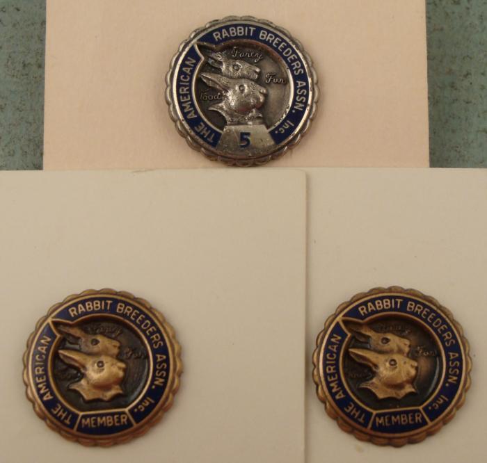 These 3 metal pins are from the Rabbit Breeders Association. Two are pin-back brass tone with blue enamel. One is a screw-back silver tone with blue enamel, and a number 5. Diameter: 1 1/2"