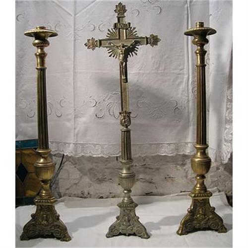 These beautiful religious pieces are probably French from 1860-1900. The base is a triangle, with the faces of Joseph, Mary and Christ. Ideal for a house or altar. Are made in bronze, the middle piece has a tonality of silverplate. One of the candlestick doesn?t have the original part, as it?s shown in one of the pictures. Are in very good conditions. The candlesticks have a height of 32.9 inches and the cross 36 inches. Width of the base of candlestick 8.2 inches and the cross 6.8.