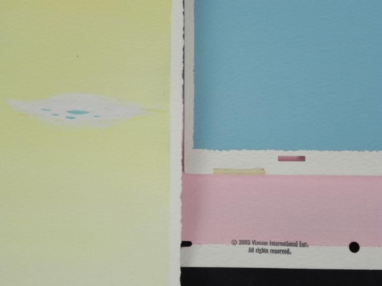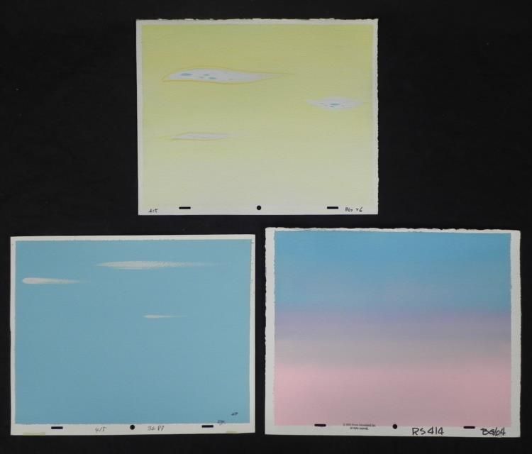 These three original production backgrounds were done for The Ren & Stimpy Show. Here are some various colors of sky, and two with white clouds . Two go together, as they are marked with the same number 415. * * Original hand painted production background, on heavy paper with pegholes and animator's notations at the lower margin Overall size is 10 1/2 x 13 and 11 x 13 1/2 inches Very good conditionDetails: One sheet has a 2003 Viacom stamp at the lower marginOriginal Production Backgrounds are used in the making of the final version of animated productions. The background establishes the location and the overall good mood of the scenee. Typically, a background layout artist creates a drawing to establish the content of the scene, placement of characters, perspective and camera angle. Based on this drawing, the background artist creates a preliminary painting to confirm all of the scenes details, then the final production background which is used in the filming of the scene. When these backgrounds are individually photographed behind the progression of production cels, and projected at a rapid succession, the images in the foreground appear to move, creating an animated scene. * These are great backgrounds if you have Ren & Stimpy animations cels--the sky's the limit! *