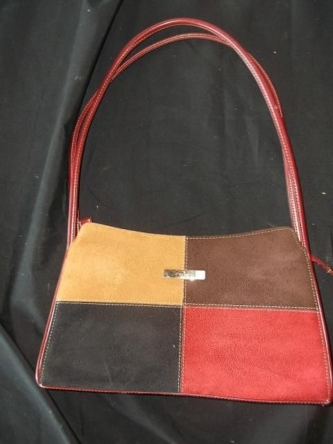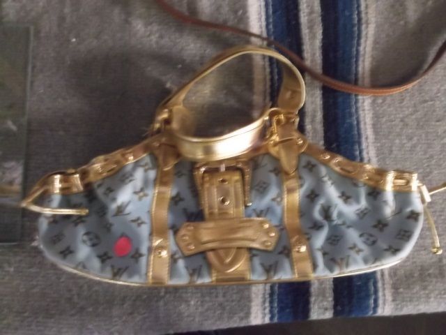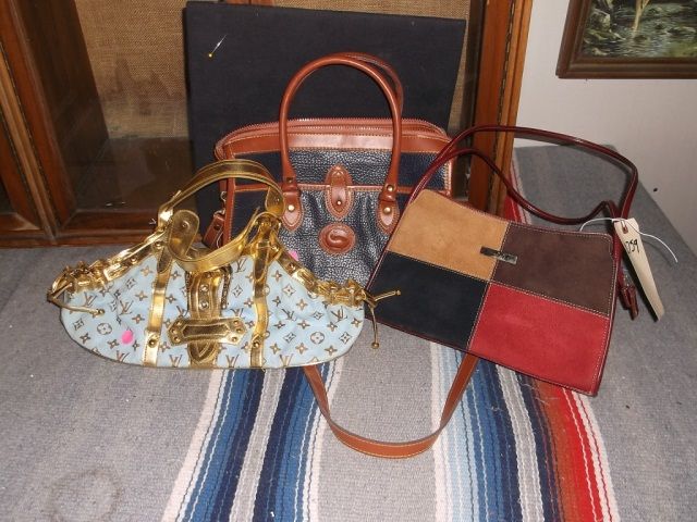 One is a Reproduction Gucci Leather Bag brown/tan/red & black approx 12" long X 7" tall, one is a reproduction Louis Vuitton Cowhide Leather Trim Man made Lining #02885 approx 17" long X 9" tall and is light blue