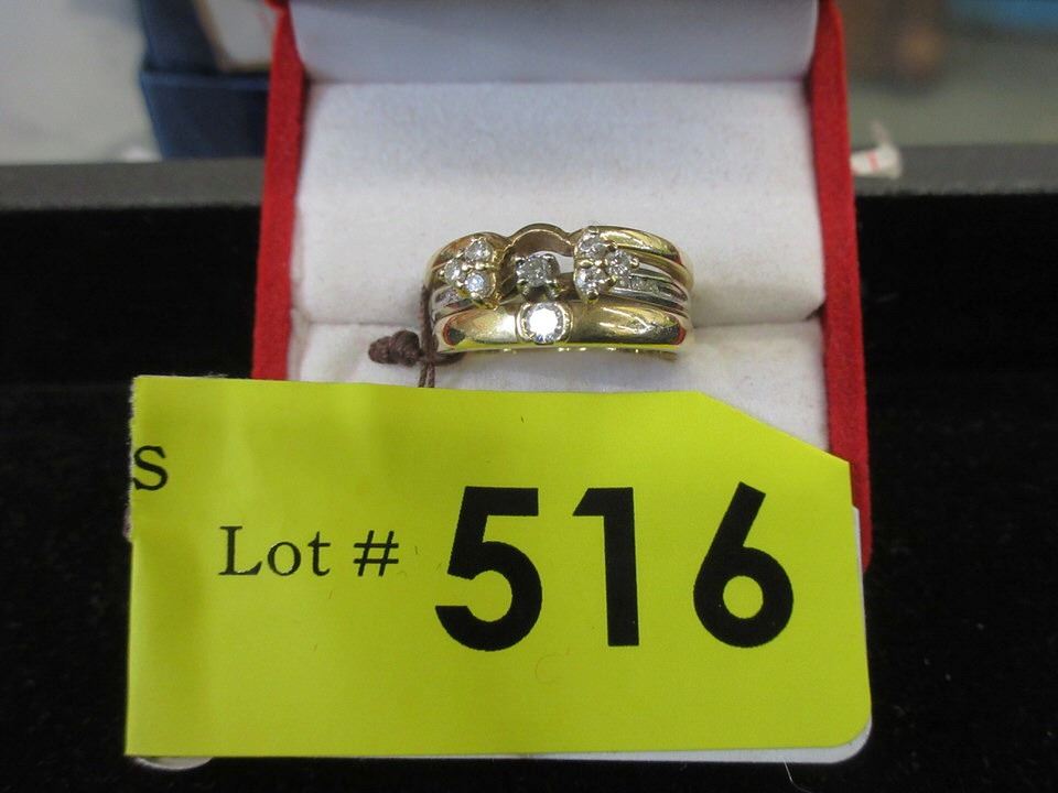 Size 6. 8 Center and 6 accent Diamonds. 10 KT White Gold Center ring and two14 KT Yellow Gold Exterior bands. Have been bonded into one ring. Retail $2,500.