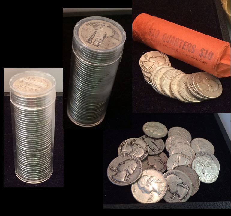 3 of rolls of silver quarters, 1964 and before, quarters that nobody has gone through, plus 18 other loose quarters. 128 silver quarters in all.