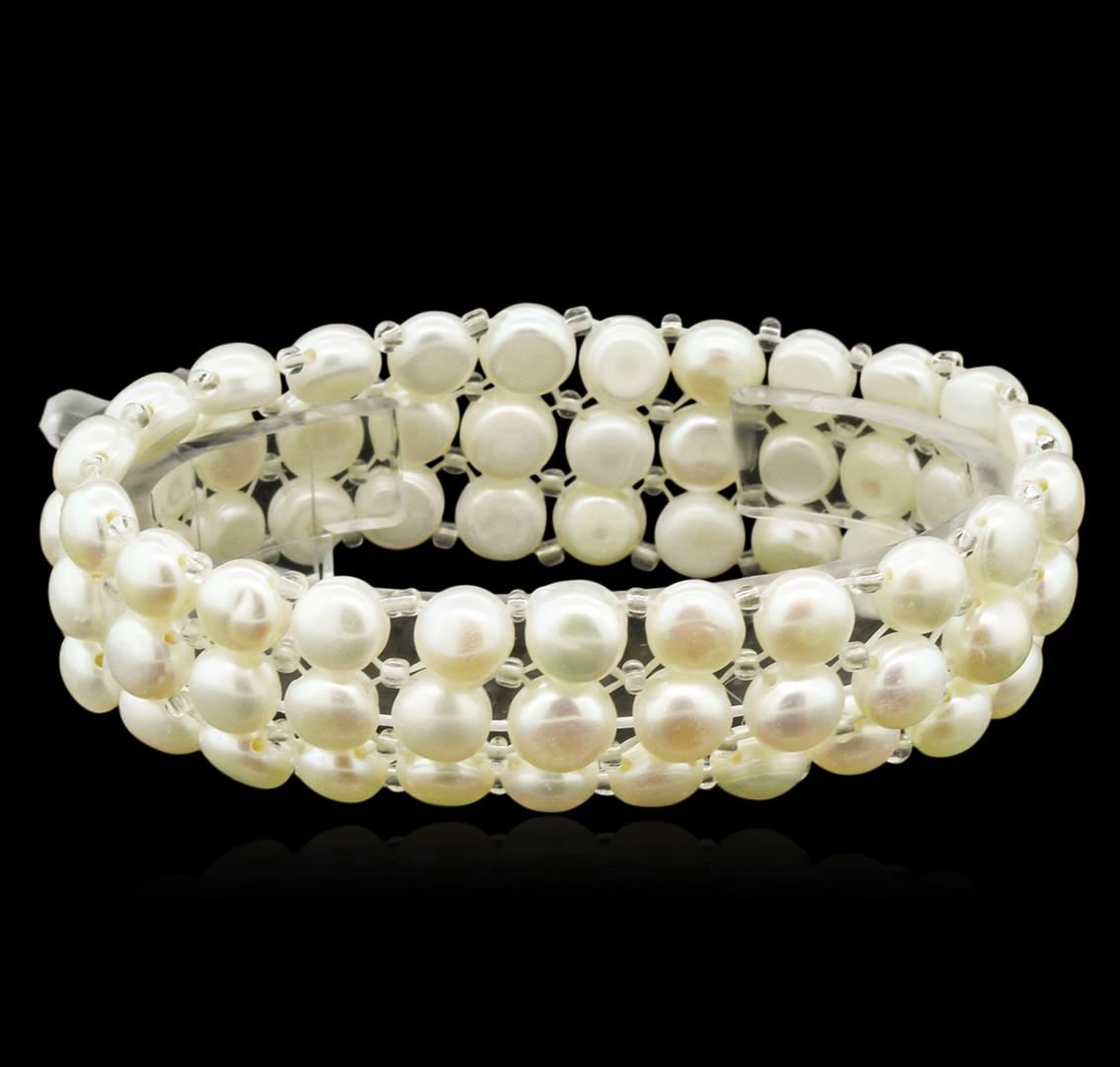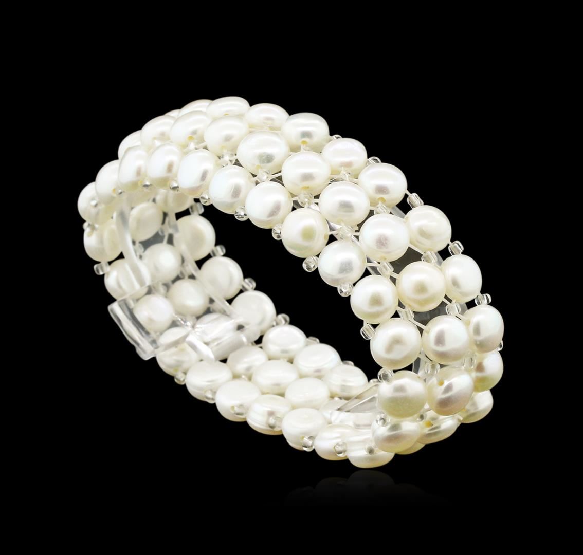 One 3 row cultured white pearl bracelet measuring approximately 6.5" (stretches for adjusting to different size wrists). The bracelet contains approximately 69 beautiful white cultured pearls. Good condition.