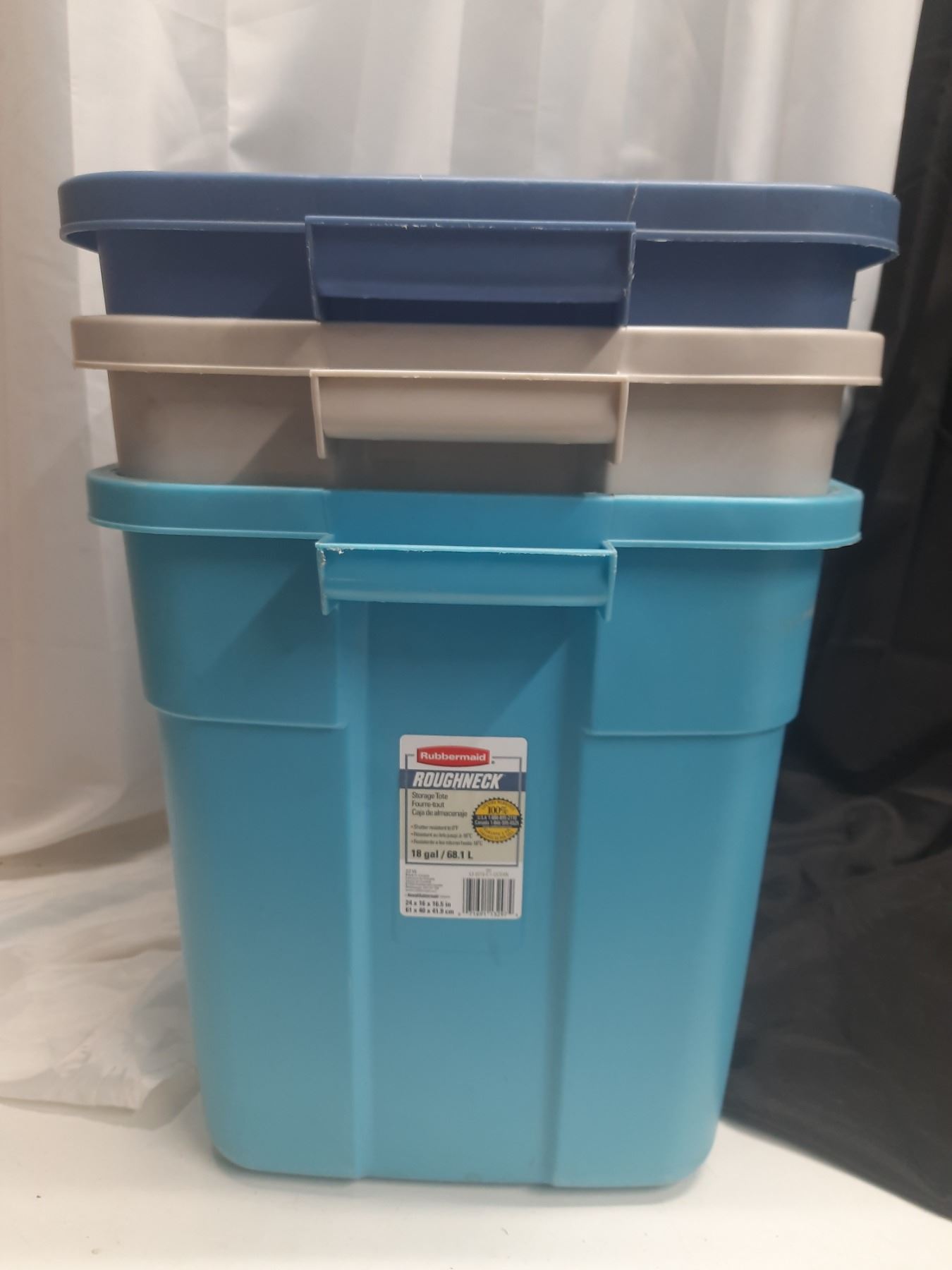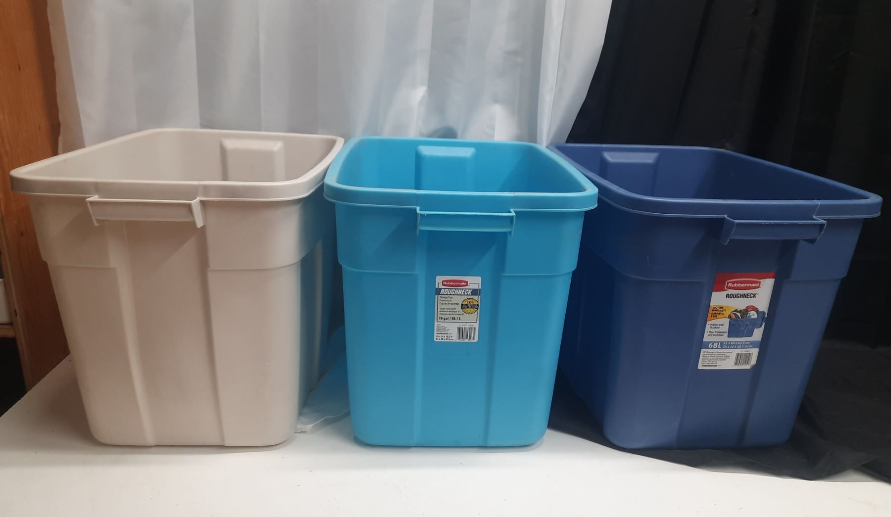 (3) Rubbermaid Roughneck Storage Tote 68L. (Different Colours)