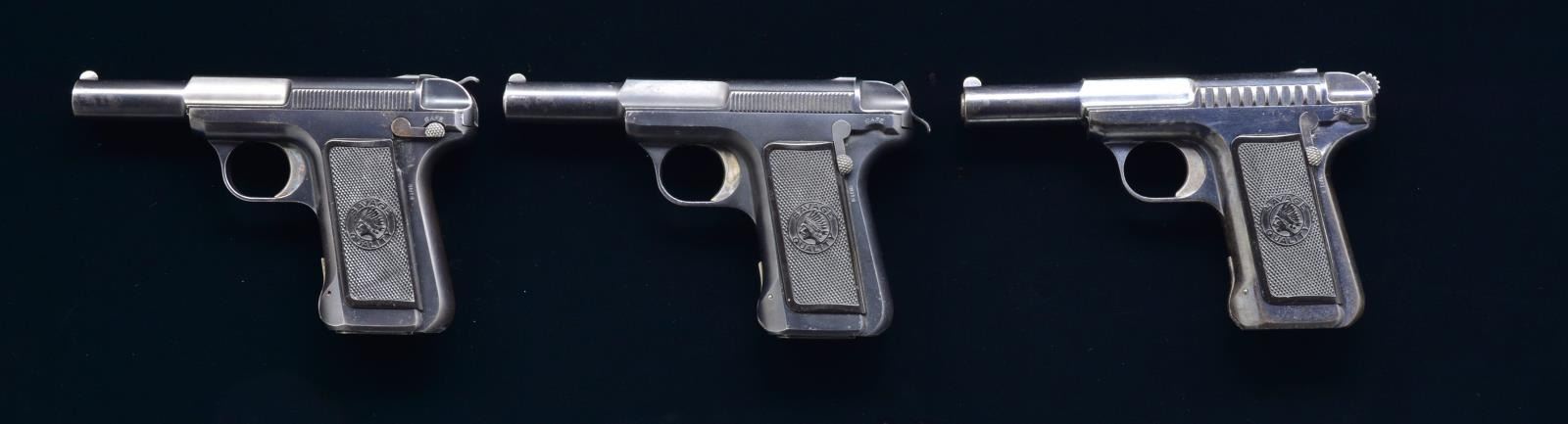 1) Cal. 7.65mm. S# 223972. Bbl. 3 3/4". Blued finish. Fixed sights. Spur trigger. Manual frame safety. Push button heel mag release. Checkered Savage gutta percha grips. Case colored trigger & mag release. MAGS: 1 - 7 rd. CONDITION: overall very good metal finish w/ light muzzle & high edge wear. Scattered handling marks & fine hard to notice old oxidation is present. Grips show areas of worn checkering. Lightly fading case coloring on the trigger while mostly faded on the mag release. (20-3840/ZAL). 2) Cal. 7.65mm. S# 216553. Bbl. 3 3/4". Blued finish. Fixed sights. Spur trigger. Manual frame safety. Push button heel mag release. Checkered Savage gutta percha grips. Case colored trigger & mag release. MAGS: 1 - 7 rd. CONDITION: overall good w/ some muzzle & high edge wear. Scattered freckled oxidation & handling marks. Grips show mild wear. Frosted fair bore w/ sharp rifling. (20-3841/ZAL). 3) Cal. 7.65mm. S# 171002. Bbl. 3 3/4". Blued finish. Fixed sights. Spur trigger. Manual frame safety. Push button heel mag release. Checkers Savage gutta percha grips. Case colored trigger & mag release. MAGS: NONE. CONDITION: overall good w/ heavier high edge wear & scattered handling marks than the other examples in this group. Fine freckled pinprick oxidation present. Grips have areas of wear w/ scattered handling marks. Mostly faded case coloring. Very good bright bore w/ sharp rifling. (20-3842/ZAL). ALL CURIO. $800-1,200.